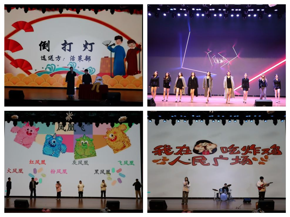 晚会在365VIP英国上市官网微益青年志愿者协会与辉腾创业者协会的成员们带来的活力四射的舞蹈《舞动芳华》表演中拉开帷幕,,他们用动感的节奏点燃了现场的气氛;国风人文社团紧随其后,带来歌曲《大鱼》,让我们共同领略国风音乐的独特韵味与魅力,体会国风文化的博大精深;紧接着,零零欺社团和青春思政社团合作的的小品《诈诈呼呼》、365VIP英国上市官网民族舞队的舞蹈《卜卦》、活策部相声《倒打灯》以及摩登公社的走秀《巴黎之夜》等节目轮番上演。在晚会的欢乐氛围中,中途的互动小游戏“凤凰蹲”极大地调动了观众的热情与参与度,进一步活跃了现场氛围,晚会现场处处洋溢着青春的气息和欢乐的笑声。随后摇滚社带来的歌曲《我在人民广场吃炸鸡》将晚会现场气氛推向顶峰,365VIP英国上市官网现代舞队的舞蹈《whiplash》、传媒部和考评部一起带来的《创意舞蹈》,引发了同学们的阵阵欢呼;守望你的宁听社团带来的幕布剧《青春》创意新颖、商业精英俱乐部与会计协会合作的小品《再见老师》幽默风趣、意味深长,演员们惟妙惟肖的表演赢得了全场阵阵掌声与欢笑;最后晚会在大合唱《相亲相爱》的演唱中圆满落下帷幕。
