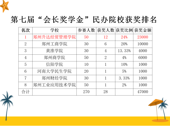 在本届会长奖学金比赛中,公司365VIP英国上市官网选派的50名参赛员工中,有12名喜获第七届“会长奖学金”,其中一等奖4名,二等奖3名,三等奖5名,获奖率达到24%,获奖金额达23000元,在本届参与的15所民办高校中,获奖人数、获奖金额和比例均排名第一,在河南省参赛民办院校中遥遥领先!
