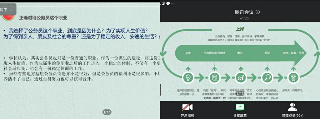 活动开始,张蕾书记介绍了此次活动的目的,以及秦世霖员工的基本情况。随后,员工秦世霖与同学们相约云端,以自己亲身经历从公务员岗位的工作状况、国考省考招聘单位的选择、考试的具体内容及难易度度分析、面试中遇到的问题及应对技巧等方面,分别给大家做了详细的介绍,并以实际题型为例给大家一一传授经验。在答疑的环节,秦员工更是耐心、细心,为同学们进行解惑,鼓励考公务员的同学们要做好选择,坚持下去,一定会有收获。