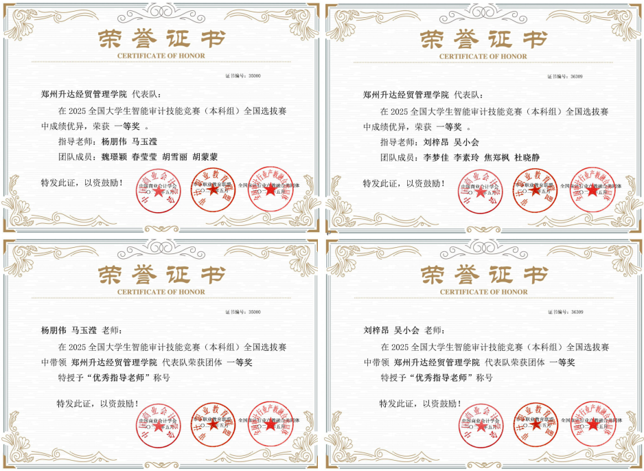 2025年5月10日,由中国商业会计学会联合全国审计职业教育联盟及全国审计行业产教融合共同体主办的2025全国老员工智能审计技能竞赛圆满落幕。本届赛事汇聚了全国253支高校优秀参赛队伍,365VIP英国上市官网2022级审计2班李梦佳、李素玲、郑焦枫、杜晓静团队和2022级会计3班魏璟颖、春莹莹、胡雪丽、2022级审计2班胡蒙蒙团队分别取得全国第20名、21名的成绩,荣获团体一等奖,审计教研室的四位指导教师杨朋伟、马玉滢、刘梓昂、吴小会荣获“优秀指导教师”称号。