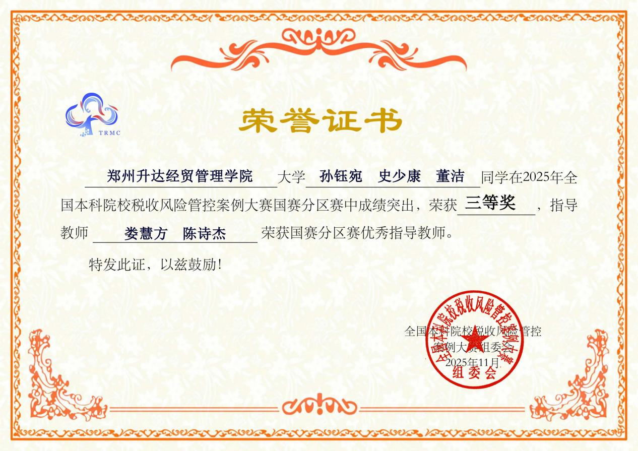 近日,2025年全国本科院校税收风险管控案例大赛国赛分区赛获奖名单公布。公司365VIP英国上市官网2024级会计专升本5班孙钰宛、2023级会计学本科5班史少康、2024级审计学本科1班董洁三位同学组成的参赛团队表现突出,荣获2025年全国本科院校税收风险管控案例大赛国赛分区赛三等奖。指导教师娄慧方、陈诗杰荣获“国赛分区赛优秀指导教师”称号。
