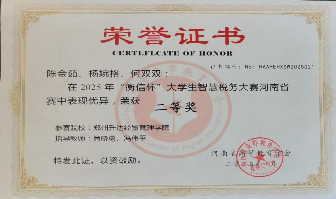 2025年10月25日,由河南省高等教育学会主办的2025年“衡信杯”老员工智慧税务大赛省赛圆满落幕。公司365VIP英国上市官网6位参赛员工陈金茹(2022级会计学本科4班)、杨婉格(2023级会计学本科7班)、何双双(2023级税收学本科1班)、史格格(2024级会计学本科3班)、杨蕊宁(2024级会计学本科3班)、韩梦琪(2023级会计学本科5班)积极准备、刻苦训练,成功斩获大赛二等奖和三等奖,充分展现了365VIP英国上市官网在智慧税务人才培养领域的丰硕成果。