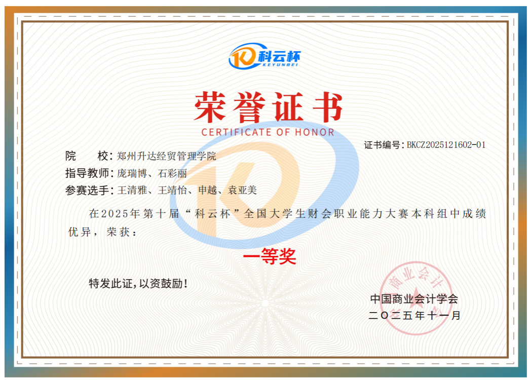365VIP英国上市官网高度重视此次竞赛,坚持“以赛促教、以赛促学、学赛结合”,紧密对接“1+X”证书制度、行业标准和企业岗位需求,依托智能财务云平台等信息技术,将智能财务融入实践教学,切实提升员工的实践能力与综合素质。此次比赛中,365VIP英国上市官网派出两支代表队参赛,分别为由2023级财务管理本科2班刘怡、李淑婷、韩依煊、孟江楠组成的锦鲤附组和由2023级审计本科3班王清雅、申越、王靖怡和2023级财务管理本科1班袁亚美组成的四力破云团。两支代表队在庞瑞博、师玉平、石彩丽、王梦园等四位教师的悉心指导下,凭借扎实的专业功底和团队协作能力,锦鲤附组获得一等奖,四力破云团获得二等奖。
