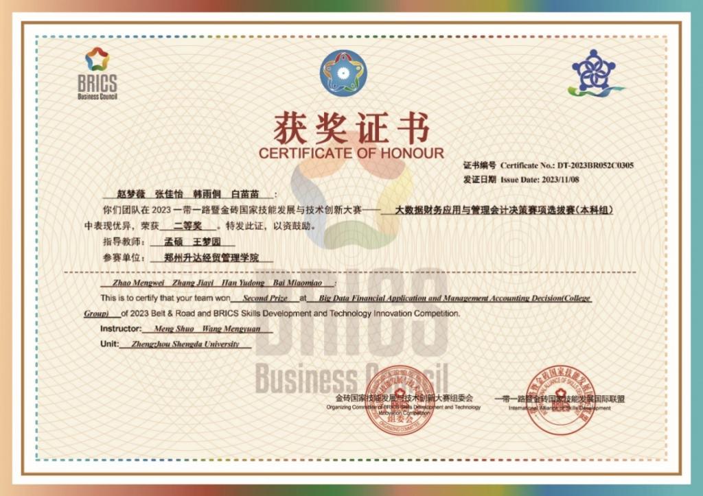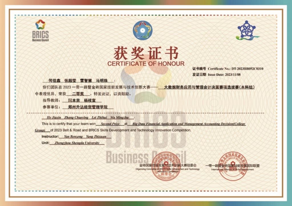 自2023年9月份开始,公司在各年级各班级大力宣传金砖大赛,吸引了很多员工踊跃报名。为了提升员工的Python编程技能和管理会计专业知识水平,公司组织闫本宗、杨支宣、王梦园和孟硕四位老师对报名的80多位员工进行线下培训,并通过校内选拔赛,选出马明珠、何佳鑫、张超莹、雷智慧、赵梦薇、张佳怡、韩雨侗、白苗苗等8位同学,组成两支参赛团队。经过老师们悉心指导和同学们两个多月的刻苦训练,最终公司代表队与河南财经政法大学、内蒙古民族大学、河北地质大学等高校代表队同获全国北区前30%的好成绩,喜获北区二等奖。