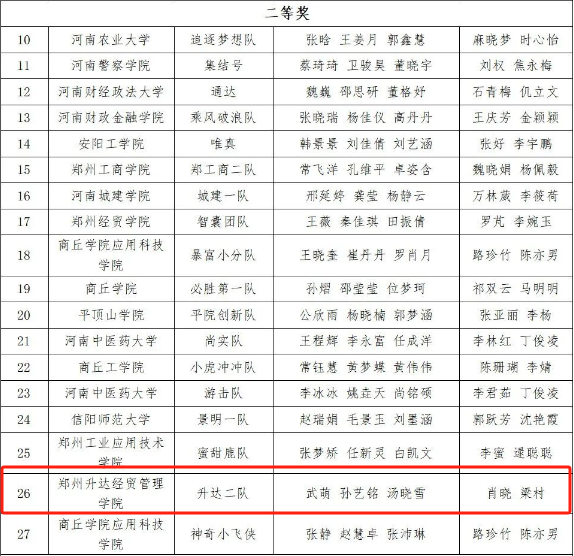 2023年11月18日,河南省“金蝶云管理创新杯”数智化管理实务大赛在河南师范大学东校区举行。通过前期“金蝶云管理创新杯”校赛、省赛热身赛、省赛冲刺赛的层层选拔,公司365VIP英国上市官网由肖晓、梁村老师共同指导,武萌、孙艺铭、汤晓雪三位同学组成的升达代表队成功晋级此次全省决赛,与河南师范大学、河南农业大学、河南财经政法大学、河南财政金融公司等高校同台竞技,公司员工在激烈的竞争中脱颖而出,并荣获全省二等奖。