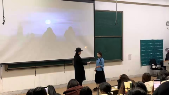 班会伊始,教室的灯光渐渐暗下,激昂的音乐缓缓响起,瞬间将同学们的思绪牵引至那个遥远的1924年。辅导员范腾飞老师与员工们精心编排的情景剧正式拉开帷幕,在昏黄的光影映衬下,紧张的气息弥漫在每一个角落。剧中人物的独白,字字铿锵、句句有力,仿佛将同学们带回到了那个年代,让大家真切地感受到了先辈们在艰难困苦中坚守信仰,为国家和民族命运不懈奋斗的伟大精神。随后,现场同学们齐声喊出“请党放心,强国有我”,声音回荡于教室中,饱含着青春的力量与坚定的信念,展现出了同学们朝气蓬勃的精神风貌和立志为祖国繁荣富强贡献力量的壮志豪情。