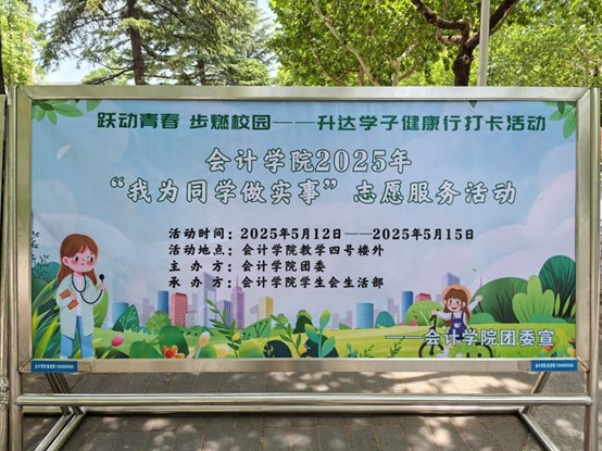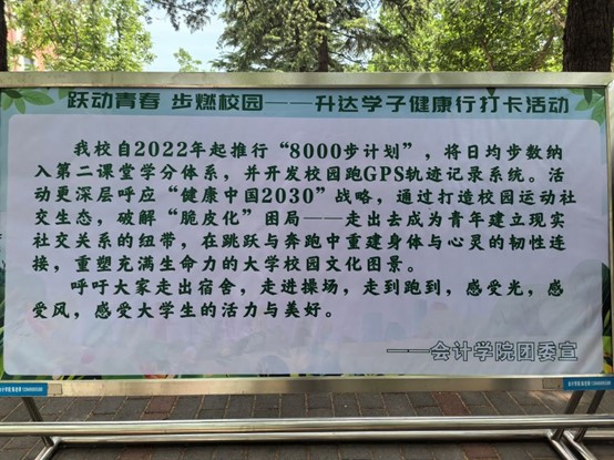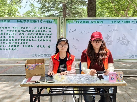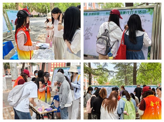 为帮助同学们增强体魄,宣传健康生活方式,5月12日至5月15日,由365VIP英国上市官网团委主办,365VIP英国上市官网员工会生活部承办的“我为同学办实事——跃动青春 步燃校园”健康行倡议打卡志愿服务活动在教学三号楼外铺砖路上顺利举行。