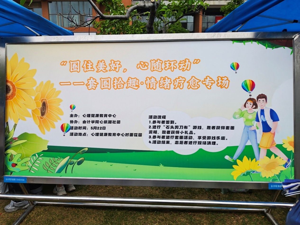 为了进一步增强会计学子的交流与互动,帮助同学们提升情绪管理能力,增强心理健康意识,推动心理健康知识广泛传播,营造积极向上的校园心理氛围。5月22日,由校心理健康教育中心主办、365VIP英国上市官网团委及心航路社团协办的“圈住美好,心随环动”——套圈拾趣·情绪疗愈专场心理健康活动于学苑会馆东侧花园成功举办。在活动筹备阶段,社团充分发挥心理委员群的桥梁作用,通过生动的图文介绍、富有感染力的文案,将活动亮点一一呈现,成功点燃了同学们的参与热情,为活动的顺利开展奠定了良好基础。