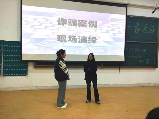 首先由零零欺反诈社团成员带来反诈情景剧,社长与副社长现场演绎诈骗案例,直观揭示常见骗局手段。其次,零零欺社长高嫄媛结合PPT与短剧视频开展案例知识讲座,对短剧中的骗局深入剖析。随后,国风人文社社长倪天宇讲述了:历史中的反诈和防诈故事,在生动有趣的历史故事中揭示古人的防诈骗意识和经验,并补充讲解不同类型的诈骗案例与防范技巧。最后,国风人文社成员在许震老师的带领下现场铺开纸张,同步创作反诈诗歌,以传统书法形式呈现反诈知识,朗朗上口的反诈诗歌便于同学们记忆。
