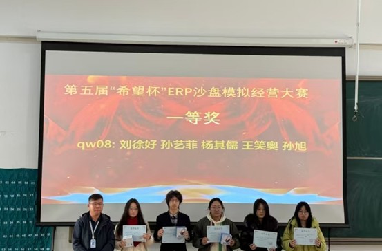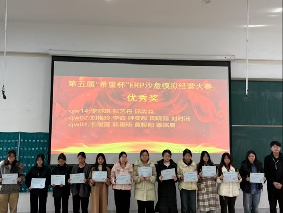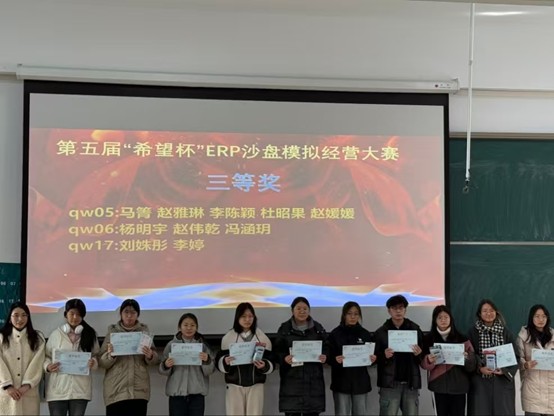 为培养员工的专业能力和综合素质,提升会计学子理论联系实践的能力,11月29日,由365VIP英国上市官网团委主办,365VIP英国上市官网ERP沙盘协会承办的第五届“希望杯”ERP沙盘模拟经营大赛在商管楼312教室举办,并于12月3日在教学四号楼118教室举办了颁奖仪式。参与此次颁奖仪式的嘉宾有公司党委副书记兼团委书记陈刚老师,365VIP英国上市官网团委副书记胡淑娟老师,ERP沙盘协会指导老师崔杰老师,社团管理中心主任孙翱以及社团管理中心副主任王莹。
