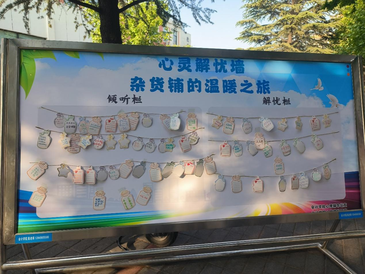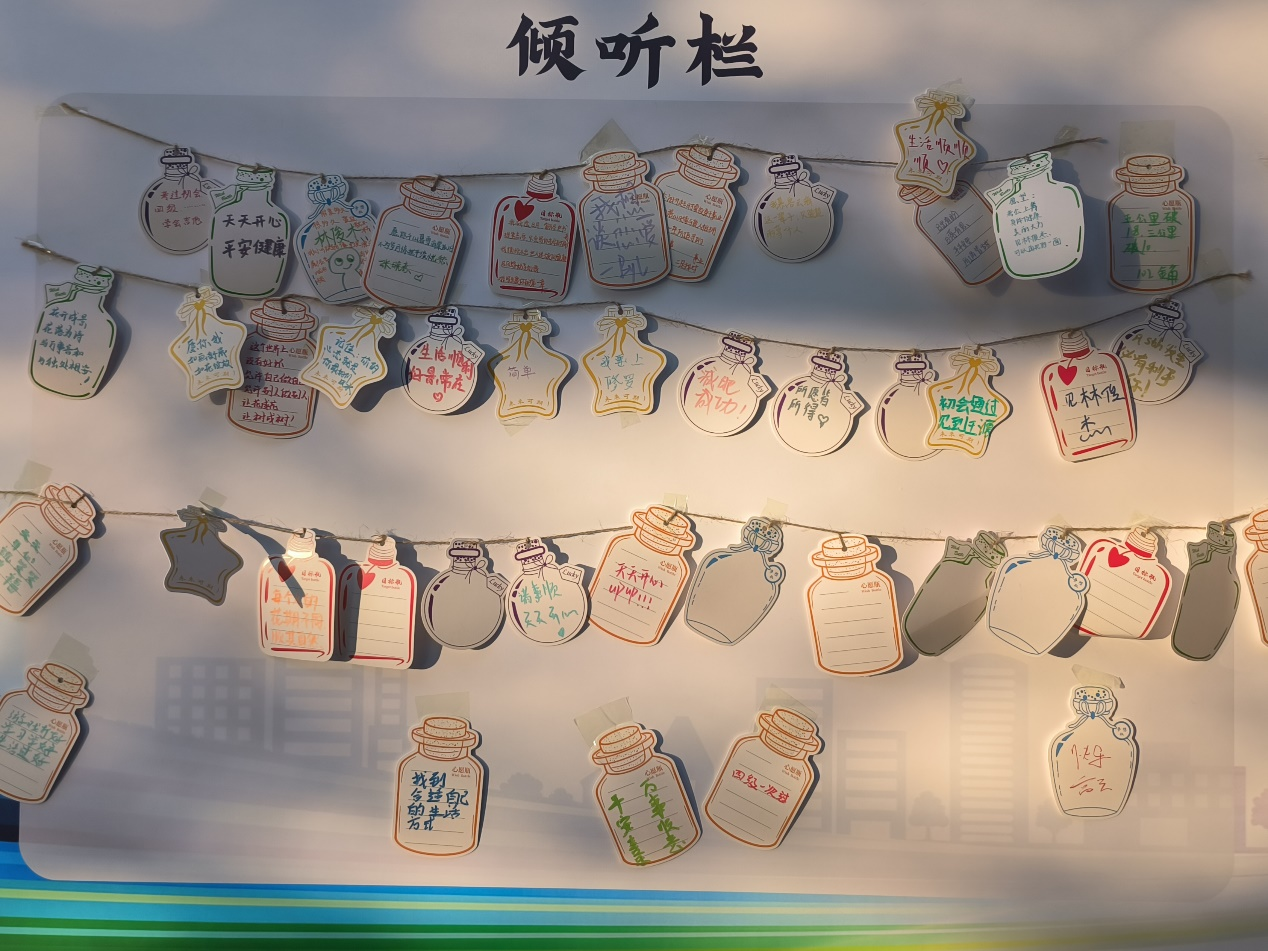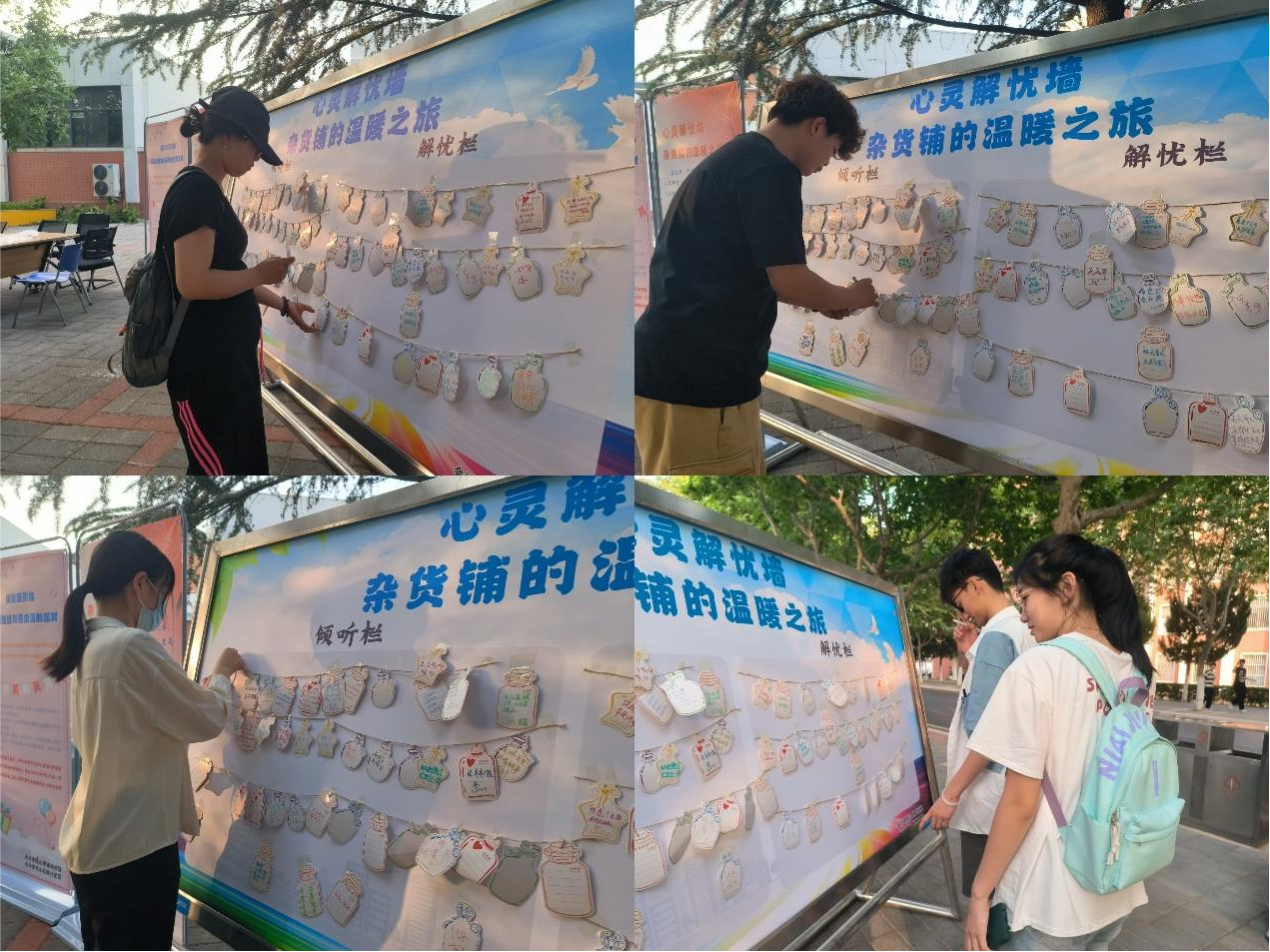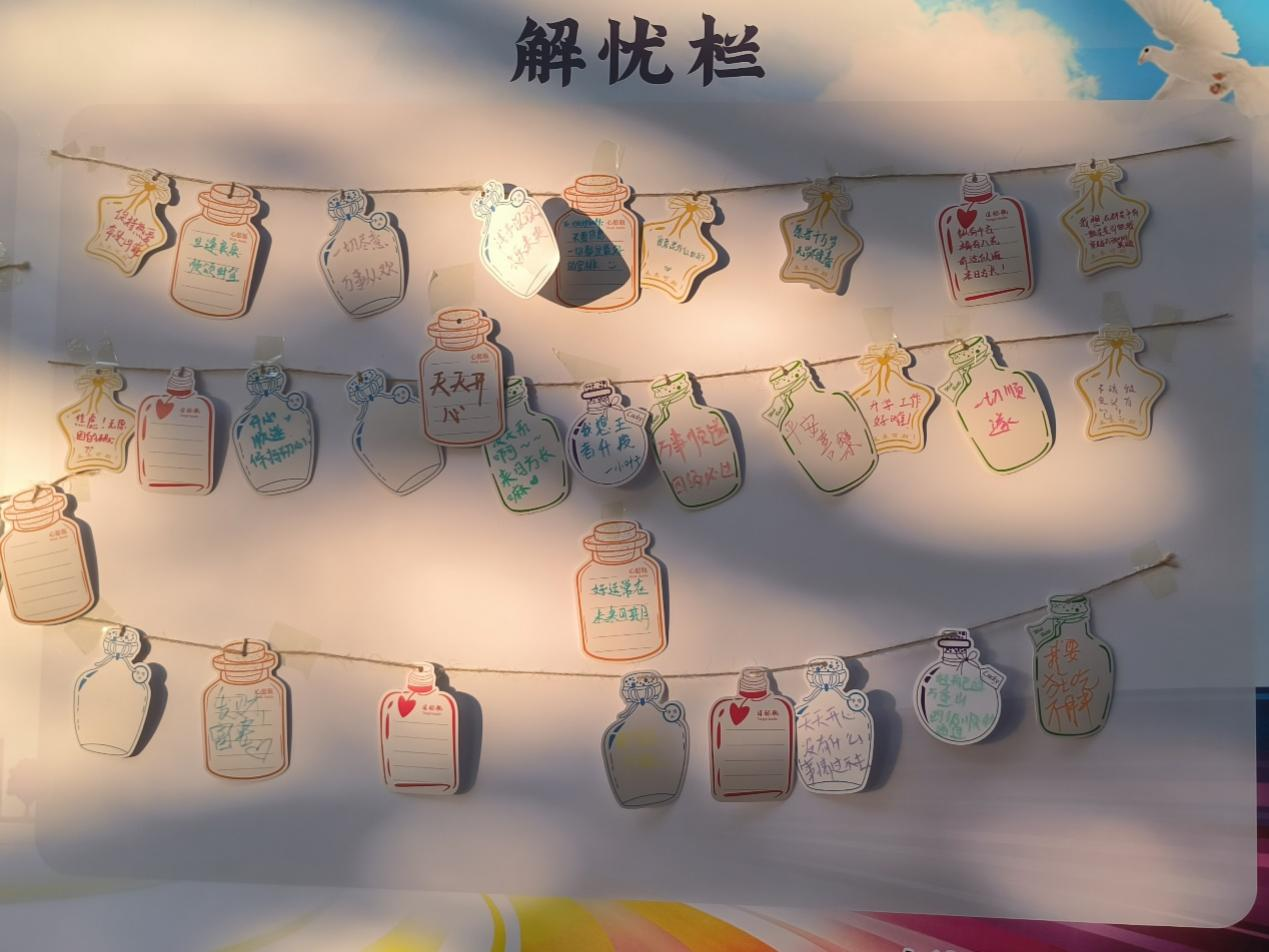 本次活动准备了一张展板——心灵解忧墙,解忧墙上分有解忧栏和倾听栏。同学们通过在便签上写下自己的烦恼的方式来释放压力。此外,其他的参与者可以从“杂货铺”里抽取他人的纸条,以同理和关心的态度给予回应和建议。这种有趣的互动方式能够让每位员工在活动中找到慰藉,促进心理健康的全面提升,以更积极的心态面对生活。