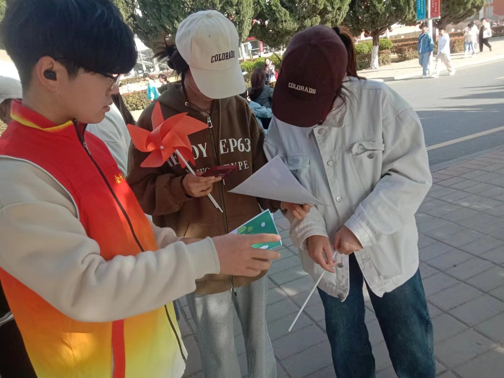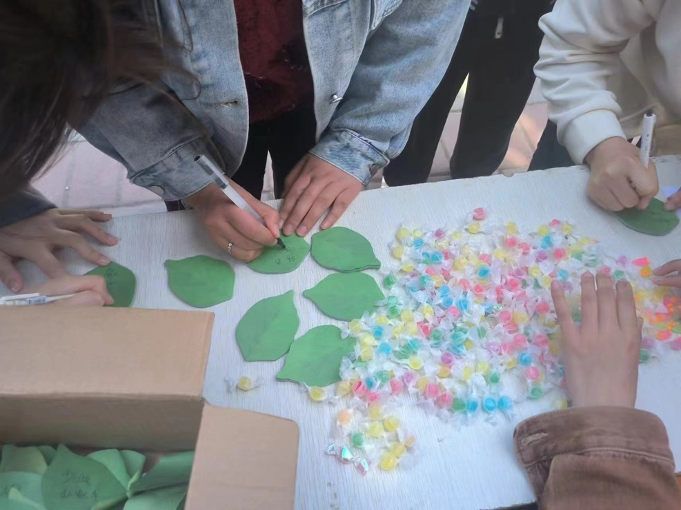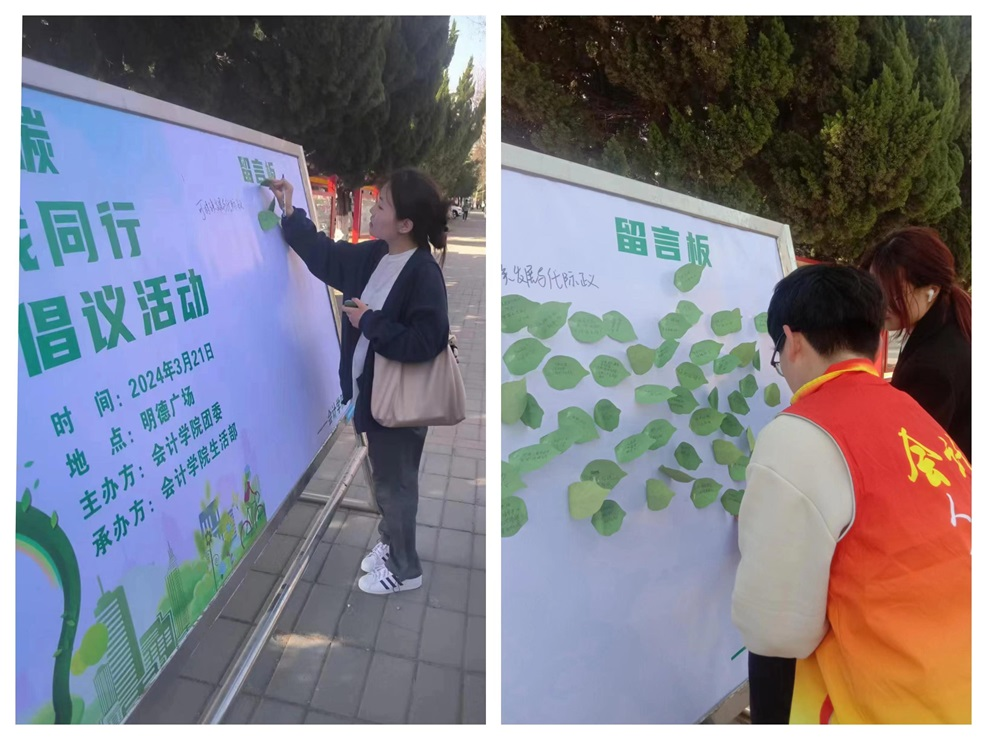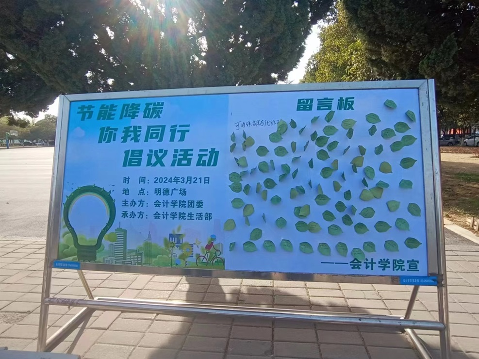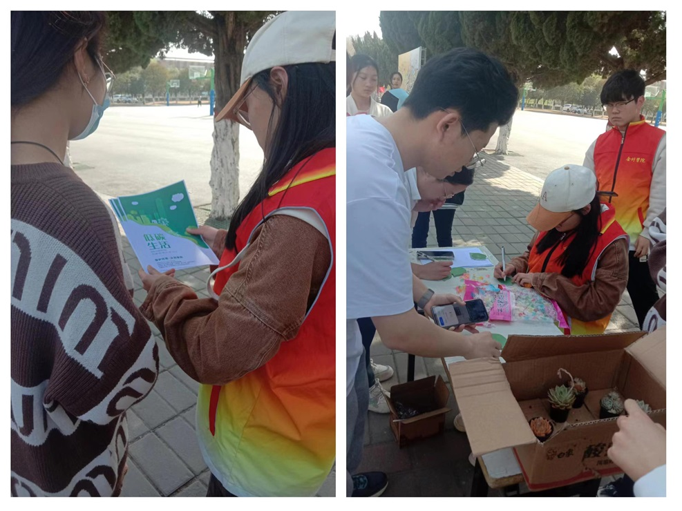 志愿者们通过在明德广场放置展板和分发海报进行宣传,使大家充分了解本次活动举办的目的。志愿者们准备的多肉植物和风车吸引了众多员工前来关注,在志愿者的引导下,同学们写下关于节能低碳、绿色环保的标语,使展板上贴满了写着标语的绿色叶子。