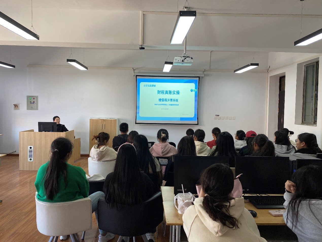 为深化产教融合,共同搭建校企合作桥梁,紧跟行业发展趋势,积极促进课堂教学改革,3月19日下午,企业导师河南赢豫财务集团陈想想会计师在“赢豫财务公司会计师工作室”(商管楼405室)针对公司会计学专业员工进行了增值税一般纳税人纳税申报系统的实践实操指导,2022级会计学本科7班部分同学参加了本次实操演练活动。