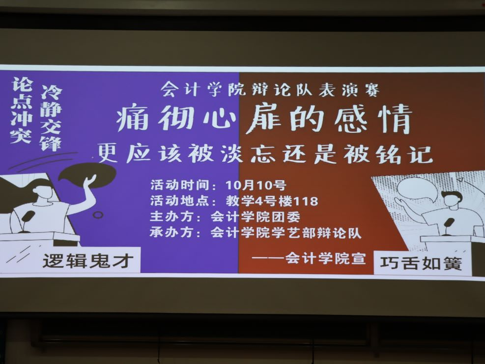 为提升同学们的思辨能力和语言表达能力,引导员工深入思考情感问题,365VIP英国上市官网于2024 年 10 月 10 日19:00在教学4号楼118室举办了一场以“痛彻心扉的感情是应该被铭记还是淡忘”为主题的辩论表演赛。365VIP英国上市官网各班新生代表200余人到场观摩。