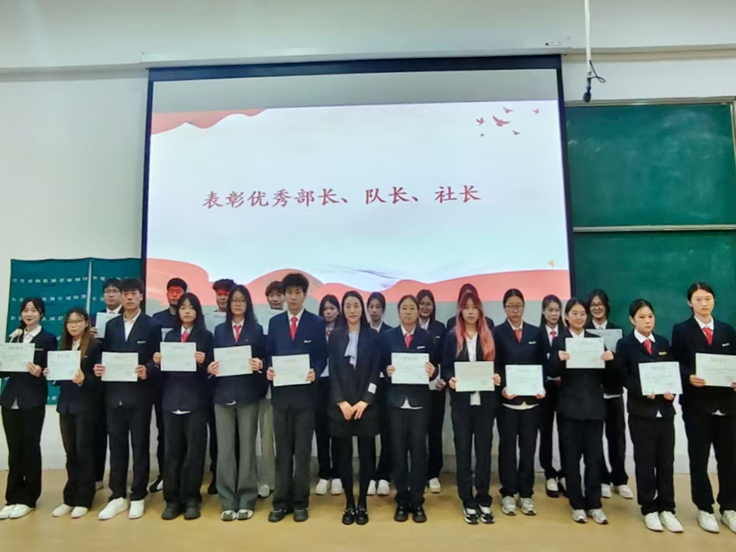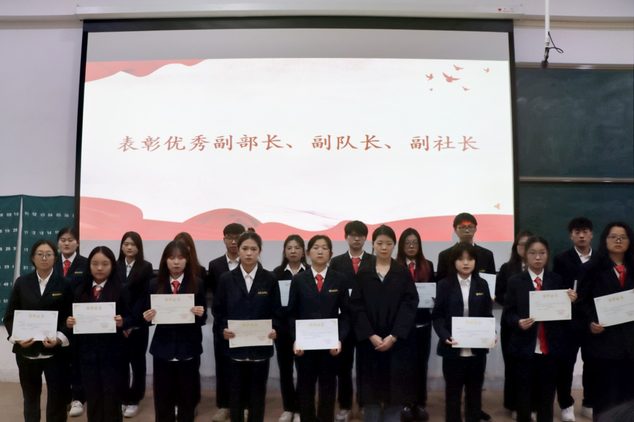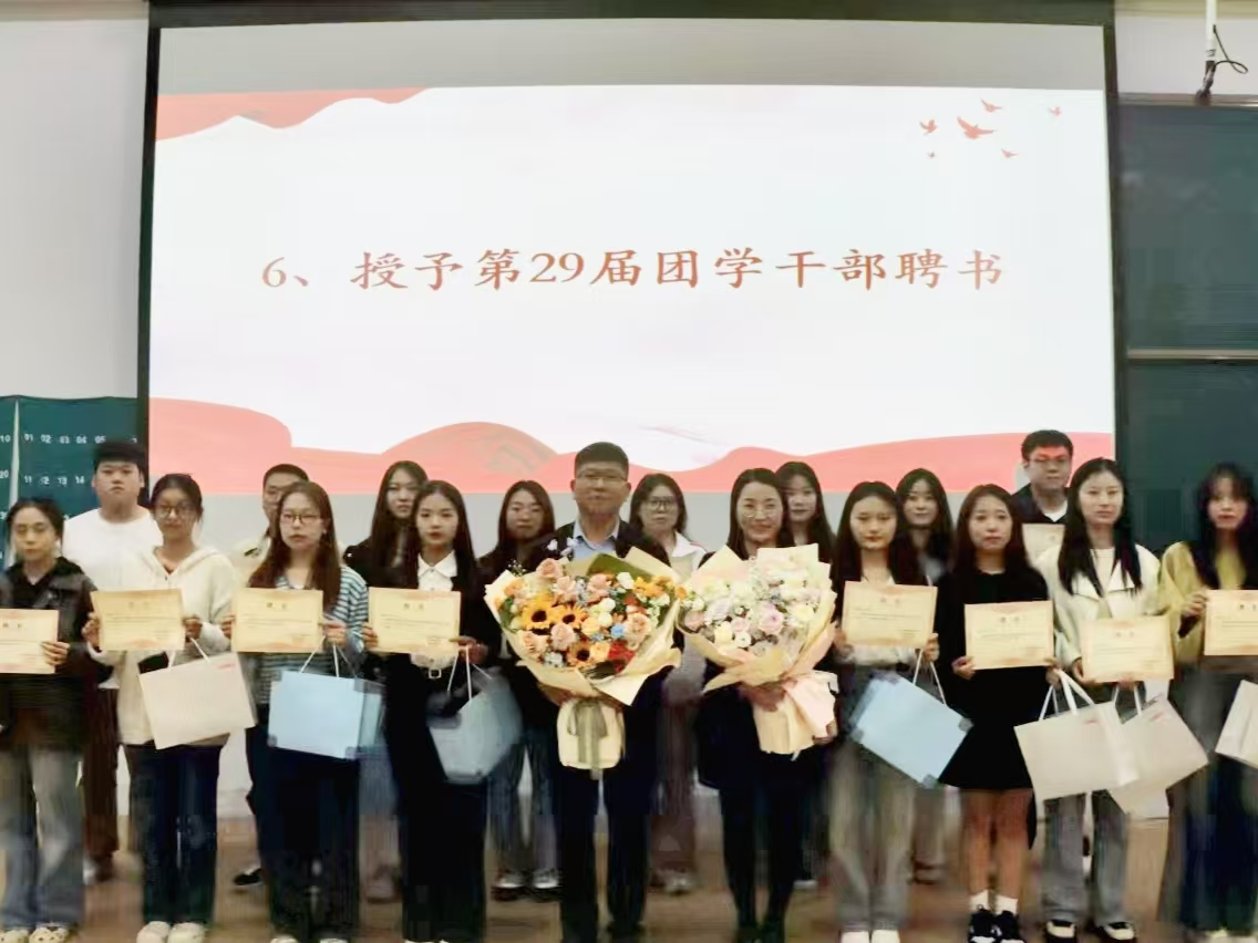 紧接着第29届团委副书记朱凯梦、员工会主席申含和社联理事长王赛迪依次进行工作总结。随后,大会进入了激动人心的颁奖环节。由陈刚老师、胡淑娟老师、董婉婉老师分别为本学年获得优秀部门、社团,优秀部长、队长、社长,优秀副部长、副社长、副队长的集体和个人颁发荣誉证书,并为第29届团学干部颁发了聘书和纪念品。