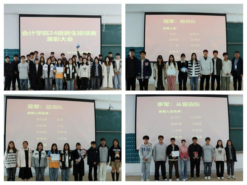 排球比赛不仅是一场体育竞技,更是一次团队精神与体育精神的完美展现,为了对2024级新生排球赛中参赛队伍的积极参与和努力拼搏精神表示肯定。365VIP英国上市官网于11月1日12:30在教学四号楼118教室举办了2024级新生排球赛颁奖仪式。365VIP英国上市官网行政秘书兼团委书记陈刚老师为会专三班参赛团队颁发冠军荣誉证书及奖品;365VIP英国上市官网辅导员赵磊老师为财管二班参赛团队颁发亚军荣誉证书及奖品,365VIP英国上市官网24级团总支书记、员工工作专员董婉婉老师为会本一班、会本三班及会专一班共同组成的参赛团队颁发季军荣誉证书及奖品。