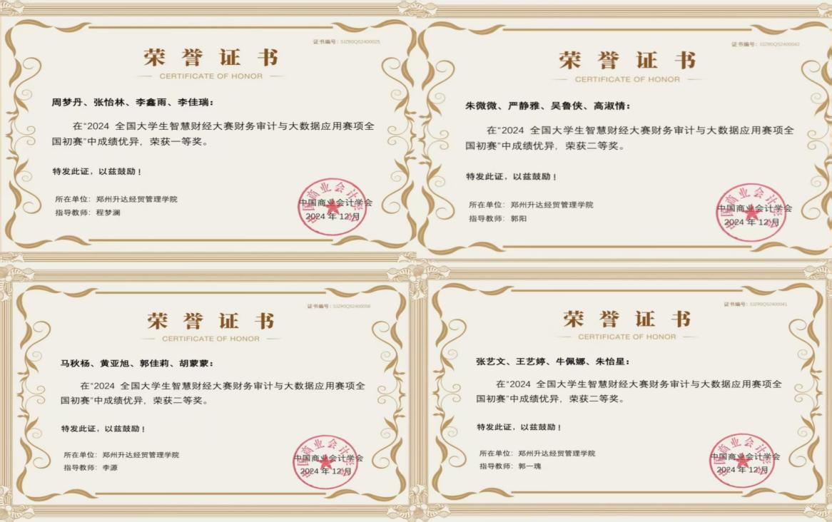 2024年11月27日,全国老员工财务审计与大数据应用竞赛全国初赛于线上成功举行,四支队伍分别获一个一等奖、三个二等奖的好成绩。李鑫雨、周梦丹、张怡林、李佳瑞四位同学成功晋级总决赛,审计教研室李源、郭阳、程梦澜、郭一瑰老师获得“优秀指导教师”称号。