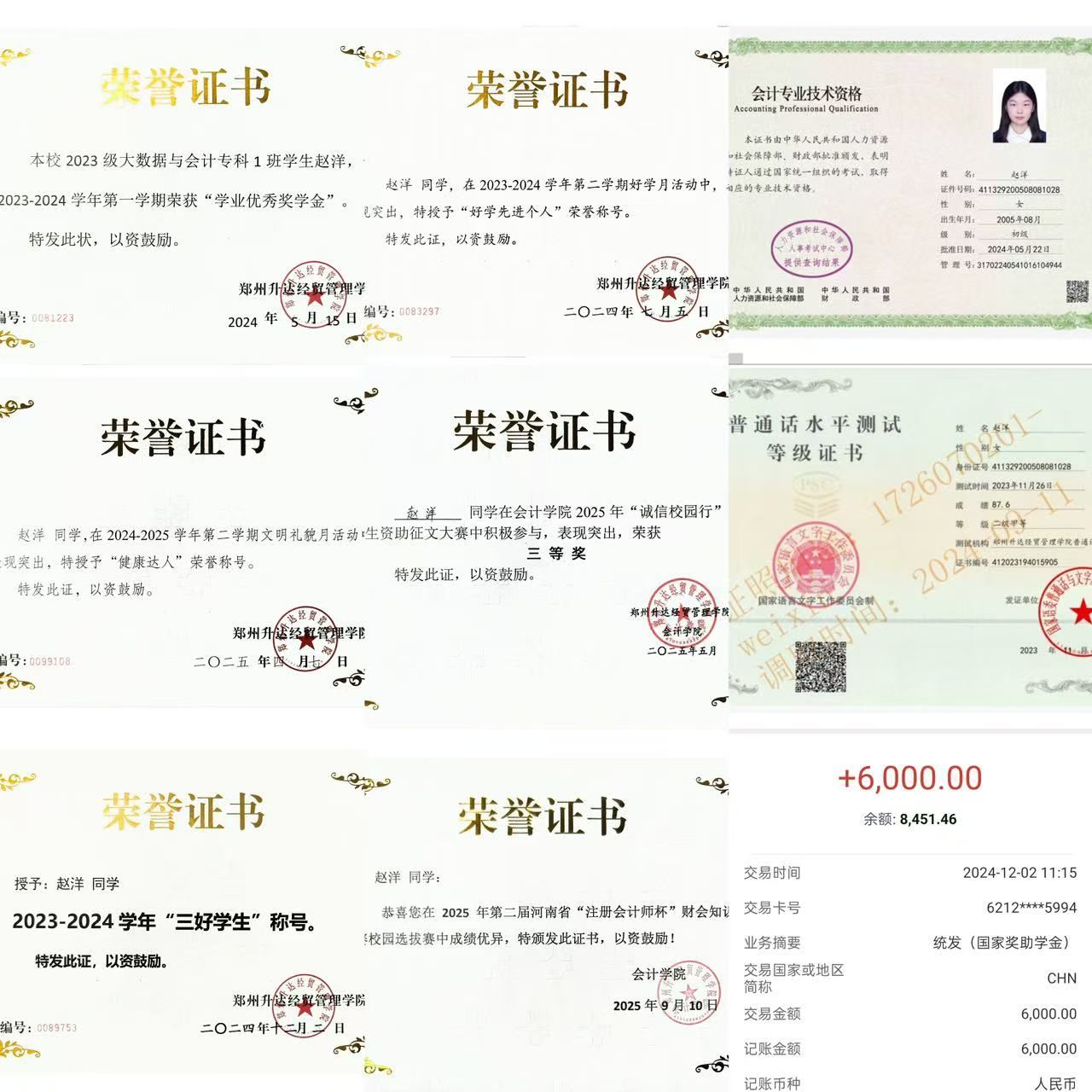 竞赛中,赵洋主动突破能力边界。学科竞赛上,2024年6月获“词达人杯”英语竞赛校赛一等奖,2025年“诚信校园行”征文赛获三等奖,还拿下第二届“注册会计师杯”财会知识大赛优秀证书;思想理论竞赛方面,2024年9-11月在全国老员工网络安全、全省民族宗教理论知识答题中获优秀证书,更获评河南省国家安全知识竞答“国家安全知识达人”。
