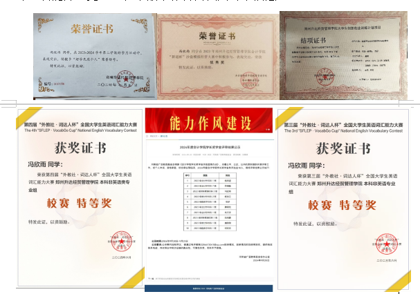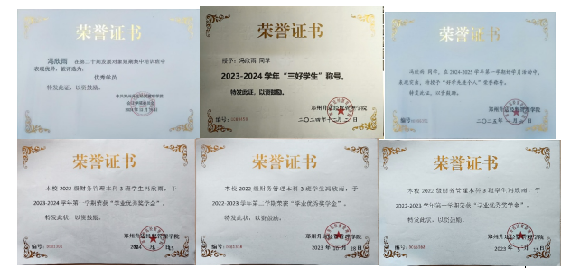 在学习上,她态度端正,刻苦努力,精益求精,入学以来加权平均成绩名列专业第一,斩获6次校级学业优秀奖学金、学长奖学金,并顺利通过初级会计证、英语四六级等考试,扎实了知识基础。同时,她以赛促学,积极参与各类专业相关竞赛,屡获佳绩,获得多项省级与校级荣誉证书,专业能力和知识运用水平得到进一步提升。