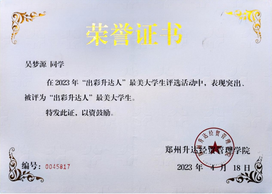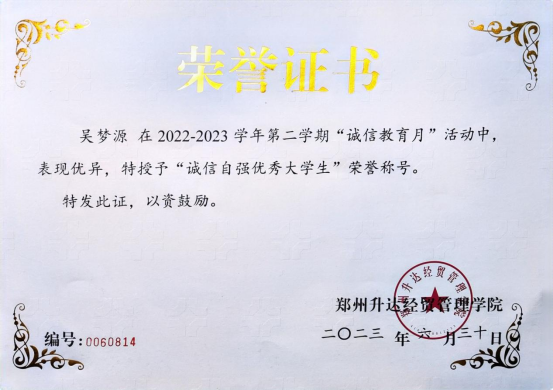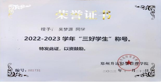 她深知“只有学习,才能改变自己的人生”。在校学习期间,她严格要求自己每节课都坐在第一排。对于学习,没有丝毫懈怠,力求把每天新学的知识点都熟练掌握,如果有不会的及时请教老师。闲暇时刻,她经常去图书馆看书学习充实自己,班级成绩一直名列前茅,多次获得校级优秀学业奖学金,并荣获2022年国家励志奖学金,多次被评为“三好员工”。在全面系统地学习了本专业的理论基础知识的同时,她努力拓宽自己的知识面,追求全面展。