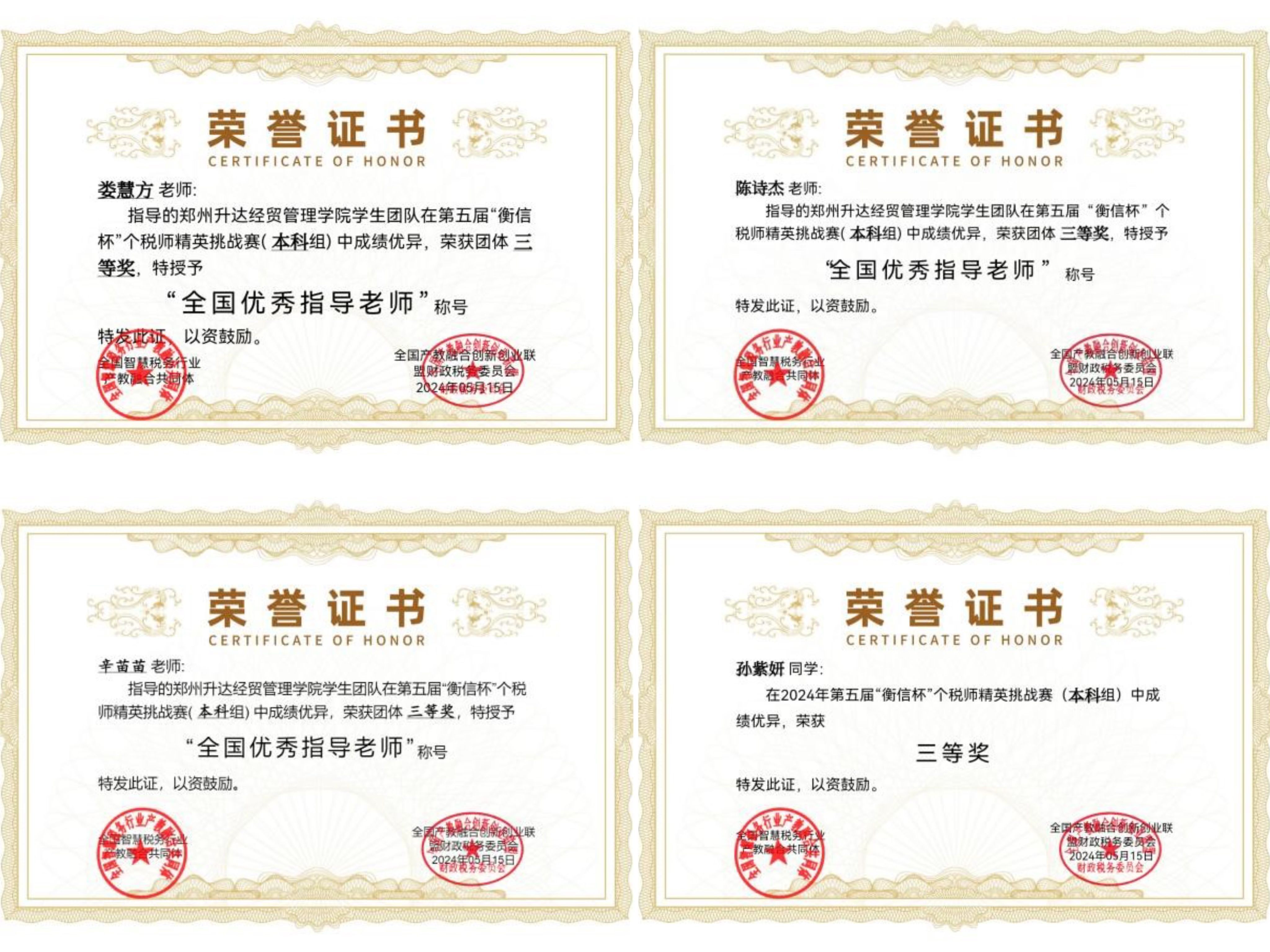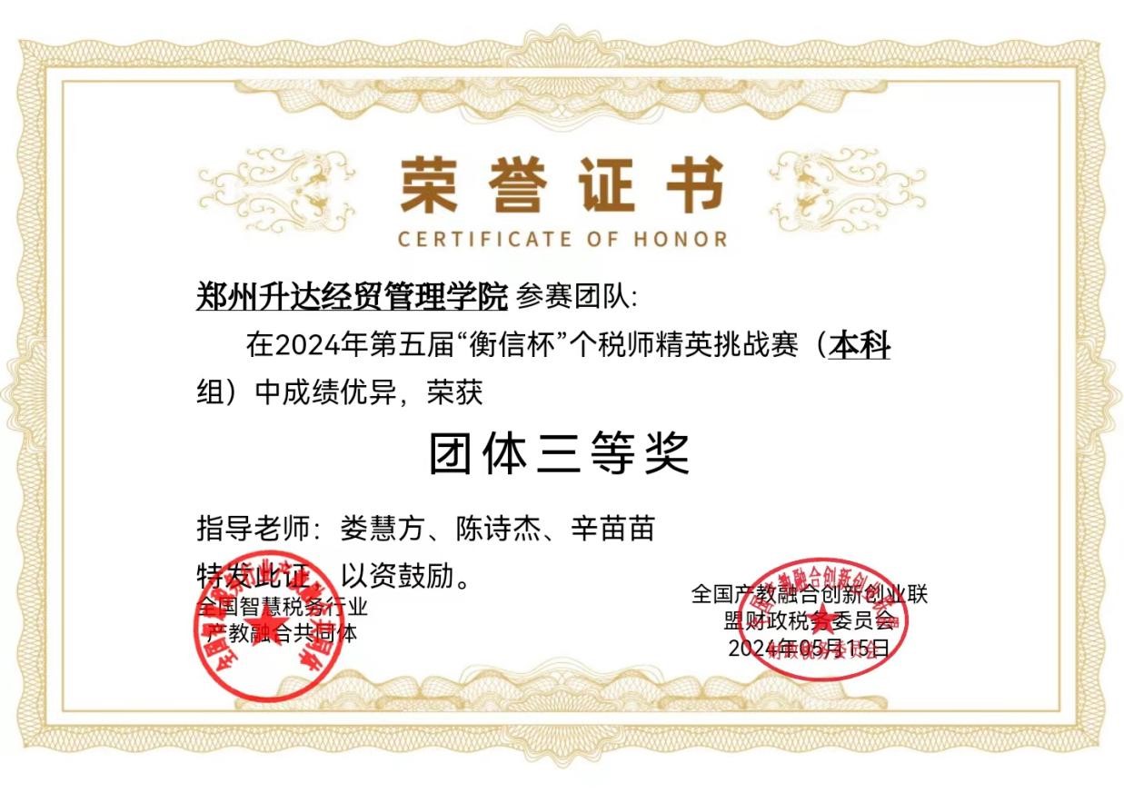 该项赛事为团体赛,通过线上网络形式进行答题,总题量490道题,题型含单选、多选、判断、业务题,每日最多答题35道,内容涵盖个人所得税知识、全面数字化电子发票知识。本科组正式竞赛时间为2024年4月28日-5月11日,经过14天的激烈角逐和不懈努力,公司参赛队伍喜获本科组“团体三等奖”,税收教研室娄慧方、陈诗杰、辛苗苗老师获得“优秀指导教师”称号,孙紫妍(2021级税收本科1班)等55位同学获得三等奖荣誉证书。