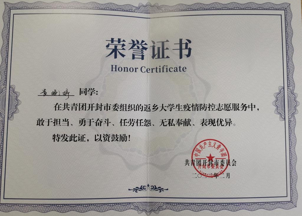 于平凡中见证伟大,作为一名志愿者,奉献自我的爱、身体力行地服务社会,是她的志向和目标。服务社会,无私奉献,为促进志愿者活动的深入发展不停奋斗和探索。努力终有收获,在3月9日辅导员鲁老师收到了共青团开封市委员会的感谢信。信中充分肯定了该生在家乡的表现,感谢我们学董事长期以来的立德树人,润物无声。感谢黄婉婷同学的无私付出。