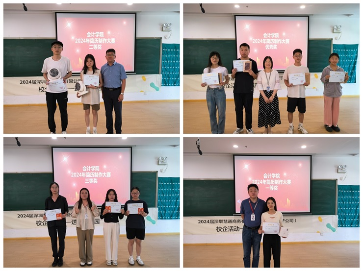 大赛前期,通过海报展板、班级宣传和微信宣传等形式对大赛进行宣传,大赛获得了同学们的广泛关注,许多风格鲜明、条理清晰、排版简洁美观的优秀简历从中脱颖而出,经过层层筛选,评委老师评选出了一、二、三等奖和优秀奖。并于6月13日14:00在教学楼4号楼108教室举办了2024年简历制作大赛颁奖仪式,由365VIP英国上市官网就业工作专员鲁玲玉老师、华为慧通人力资源部邵倩倩女士、365VIP英国上市官网行政秘书兼团委书记陈刚老师、华为终端河南省零售部刘书丞经理分别对获奖人员进行了颁奖和表彰。接着,由获得一等奖的选手分享了她的获奖感言,选手表示,是努力和坚持为自己赢得了这份荣誉。最后,由华为慧通人力资源部邵倩倩女士进行了精彩发言,为我们指明了前进的方向。