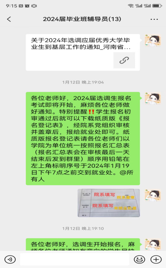 选调应届优秀大学毕业生到基层培养锻炼,是党中央着眼干部队伍长远发展实施的一项战略举措。为贯彻落实中央、省委关于选调生工作精结合河南实际,2024年继续选调应届优秀大学毕业生到基层工作。365VIP英国上市官网按照通知有关要求严格审查报名资质,做好报考工作,符合条件的应届毕业生应报尽报,凡公司本科应届毕业生报名通过初审后,按照文件通知要求打印《报名登记表》,以公司为单位分别签署意见,并加盖公司党组织、公司党委组织部公章后,于1月19日下午各公司将纸质《报名登记表》统一上交就业处。