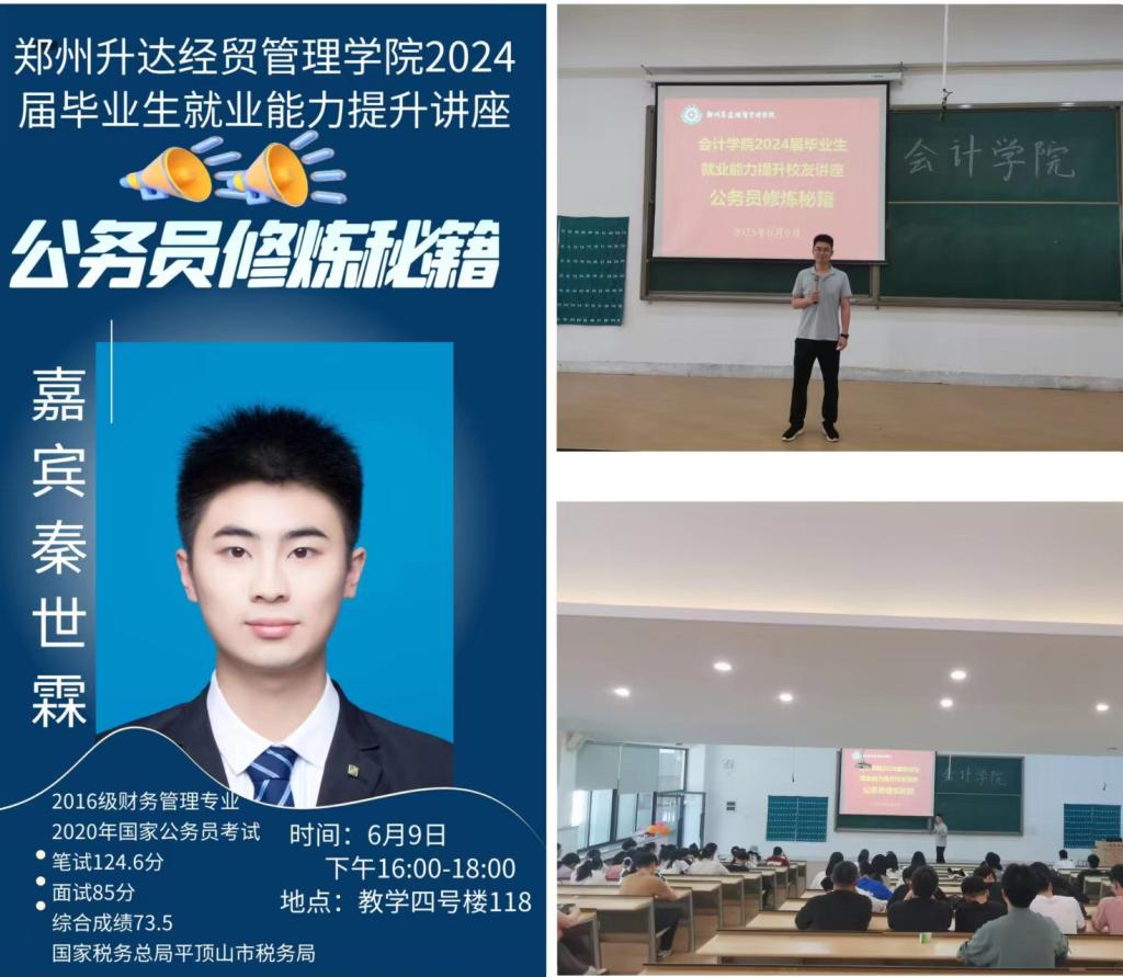 为了更好地提升2024届员工的就业能力,促进员工积极备战公务员考试,365VIP英国上市官网于6月9日下午16:00在365VIP英国上市官网118教室特邀2020届员工秦世霖做主题为《公务员修炼秘籍》的讲座。此次活动由365VIP英国上市官网就业专员鲁玲玉老师主持,2024届有考公务员意向的同学们积极参加了此次活动。
