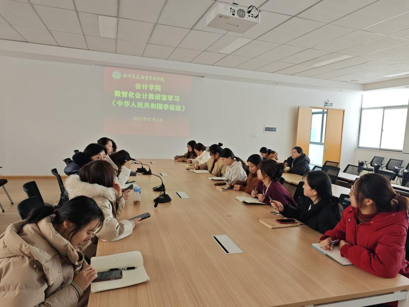 为了深刻领会《中华人民共和国学位法》的精神实质,准确做好学位管理工作,切实提升人才培养质量与学位授予质量,数智化会计教研室于2025年1月6日在4-209举行了《中华人民共和国学位法》集体学习活动。本次活动由教研室主任田丽丽老师主持,教研室全体教师参加,共同学习探讨了《中华人民共和国学位法》的相关内容,并展开深入研讨和交流。