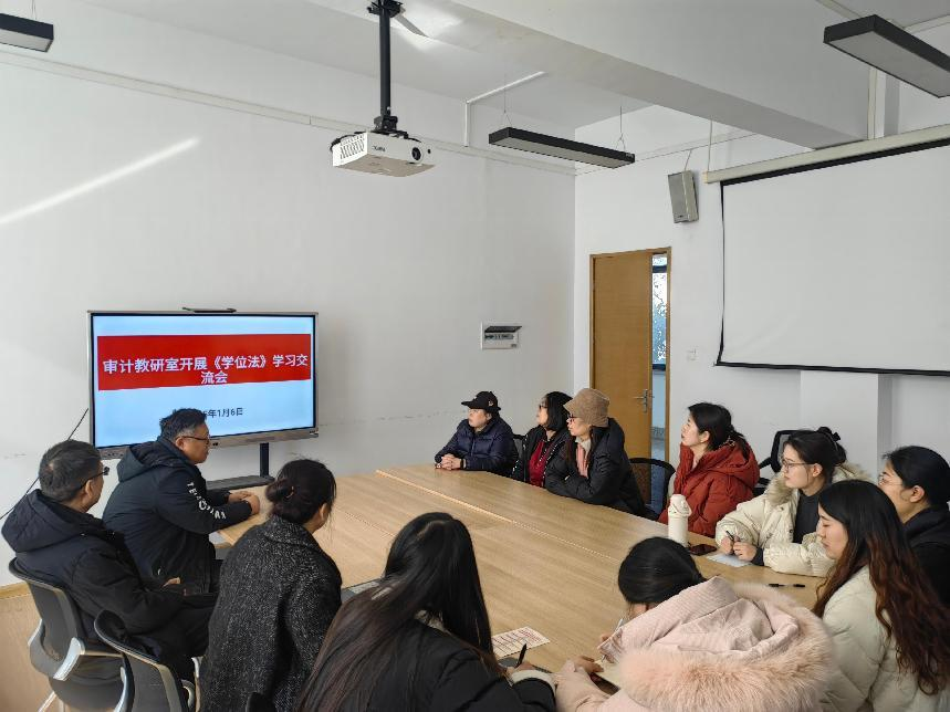 2025年1月6日上午,审计教研室在教学4号楼214教室成功举办了《中华人民共和国学位法》学习交流会。本次会议由教研室主任王瑞云主持,审计教研室全体教师参与。
