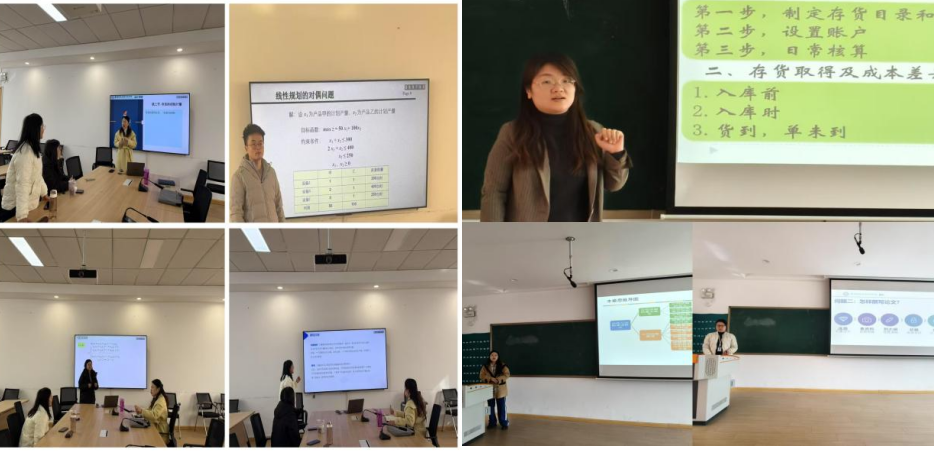 本次磨课教研室全体教师于2025年2月15日至16日分六组进行。第一组在教研室主任田丽丽老师的组织下,周玉浩、王梦园和刘金瑞等四位老师在4-209对本学期所任教的《中级财务会计I》、《管理运筹学》和《统计基础》课程进行了讲解展示,重点对课程教学中师生互动方式,现代信息技术融合应用手段进行了分析和探讨。