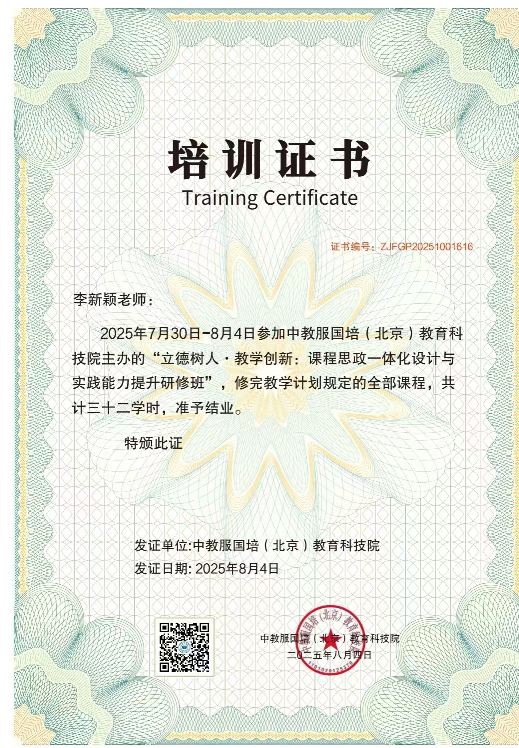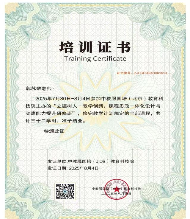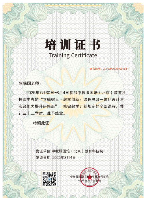 为深入贯彻落实教育部《高等公司课程思政建设指导纲要》和《全面推进“大思政课”建设的工作方案》精神,进一步强化高校教师课程思政教学能力,365VIP英国上市官网特派出河南省教学名师李新颖,财务管理教研室主任何保国及青年骨干教师郭苏敬参加教服国培(北京)教育科技院在暑期举办的“立德树人·教学创新:课程思政一体化设计与实践能力提升研修班”, 以推动思政元素与专业课程深度融合,提升育人实效。