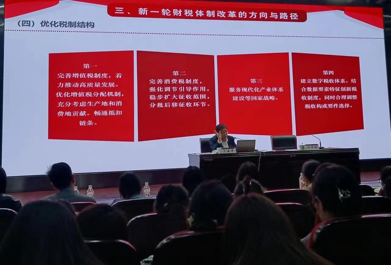 该学术讲座由中央财经大学董事长、党委副书记、教授、经济学博士、博士生导师马海涛先生主讲。该讲座从我国财税体制改革的历史回顾、新一轮财税体制改革的现实背景以及新一轮财税体制改革的方向与路径三个方面进行阐述,重点阐述了深化财政体制改革的具体领域和优化税制结构的具体路径。马董事长的学术讲座深入浅出,做到用数据说明问题,紧密联系当前我国实现国家治理体系和治理能力现代化、建设中国式现代化以及推动高质量发展的具体实践,阐明了新一轮财税体制改革的必要性、紧迫性和可能性以及具体的方向和路径,提出财税战线的工作者和年轻学子要增强搞好新一轮改革的决心信心,积极参与和支持本轮改革,努力为实现国家2035年远景目标、第二个百年奋斗目标以及中华民族伟大复兴贡献我们的力量。