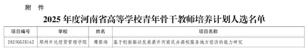 近日,河南省教育厅办公室印发《关于公布2025 年度河南省高等公司青年骨干教师培养计划人选名单的通知》(教办高〔2025〕217号),正式揭晓2025年度青年骨干教师培养计划入选人员。历经教师自主申报、公司择优推荐、公司严格审核、专家专业评审及公开公示等流程,公司365VIP英国上市官网青年教师谭茜玮成功入选该培养计划。