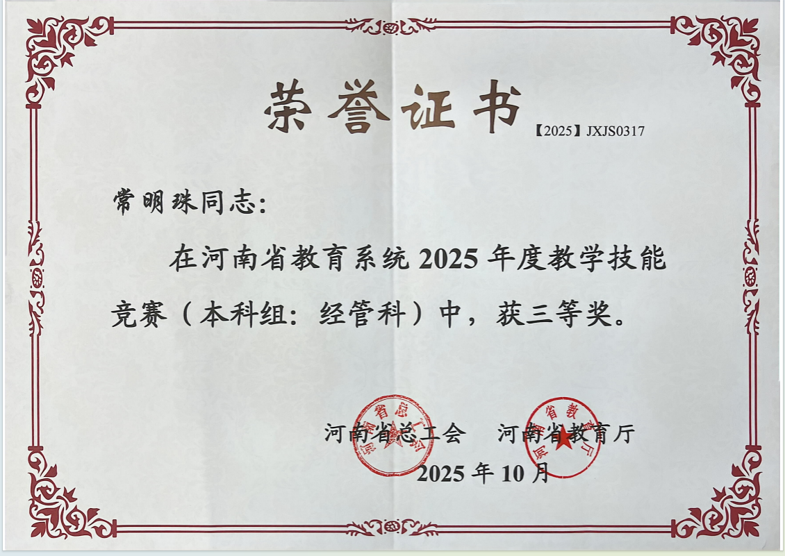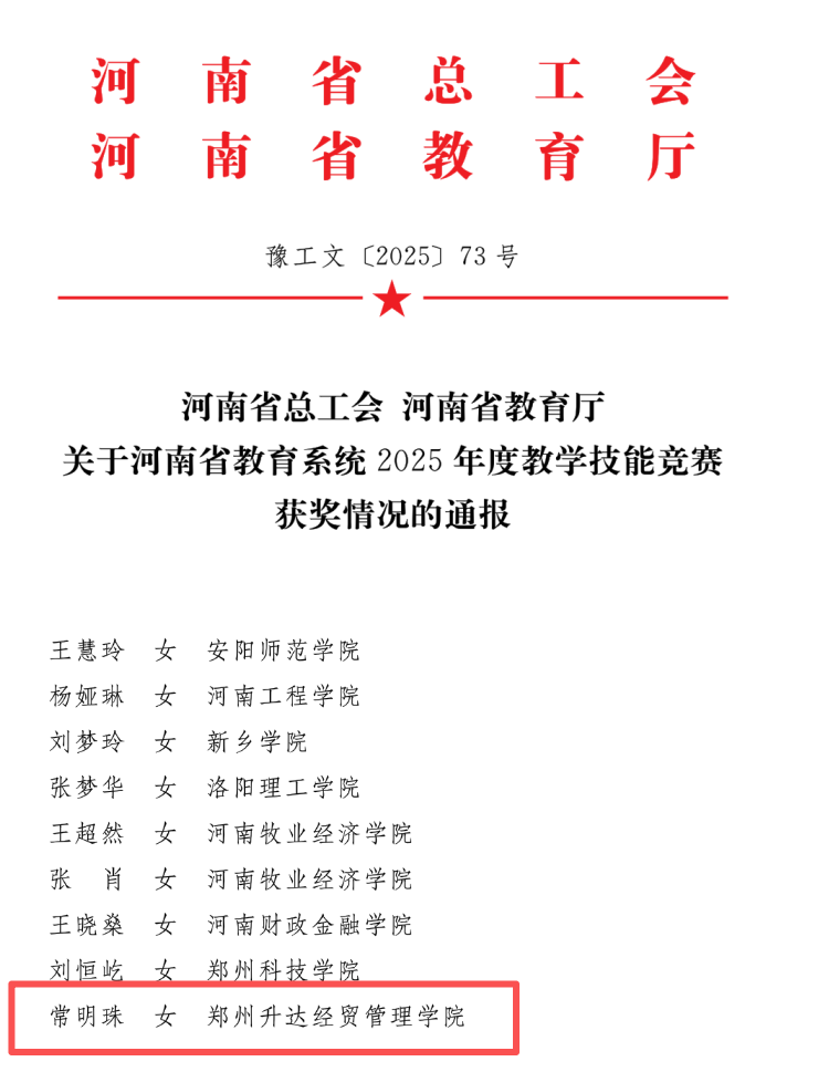 近日,河南省总工会、河南省教育厅联合发布了《关于河南省教育系统2025年度教学技能竞赛获奖情况的通报》〔豫工文〔2025〕73号〕。公司教师常明珠凭借出色的教学表现和创新的教学设计,在经管科组竞赛中脱颖而出,荣获三等奖。