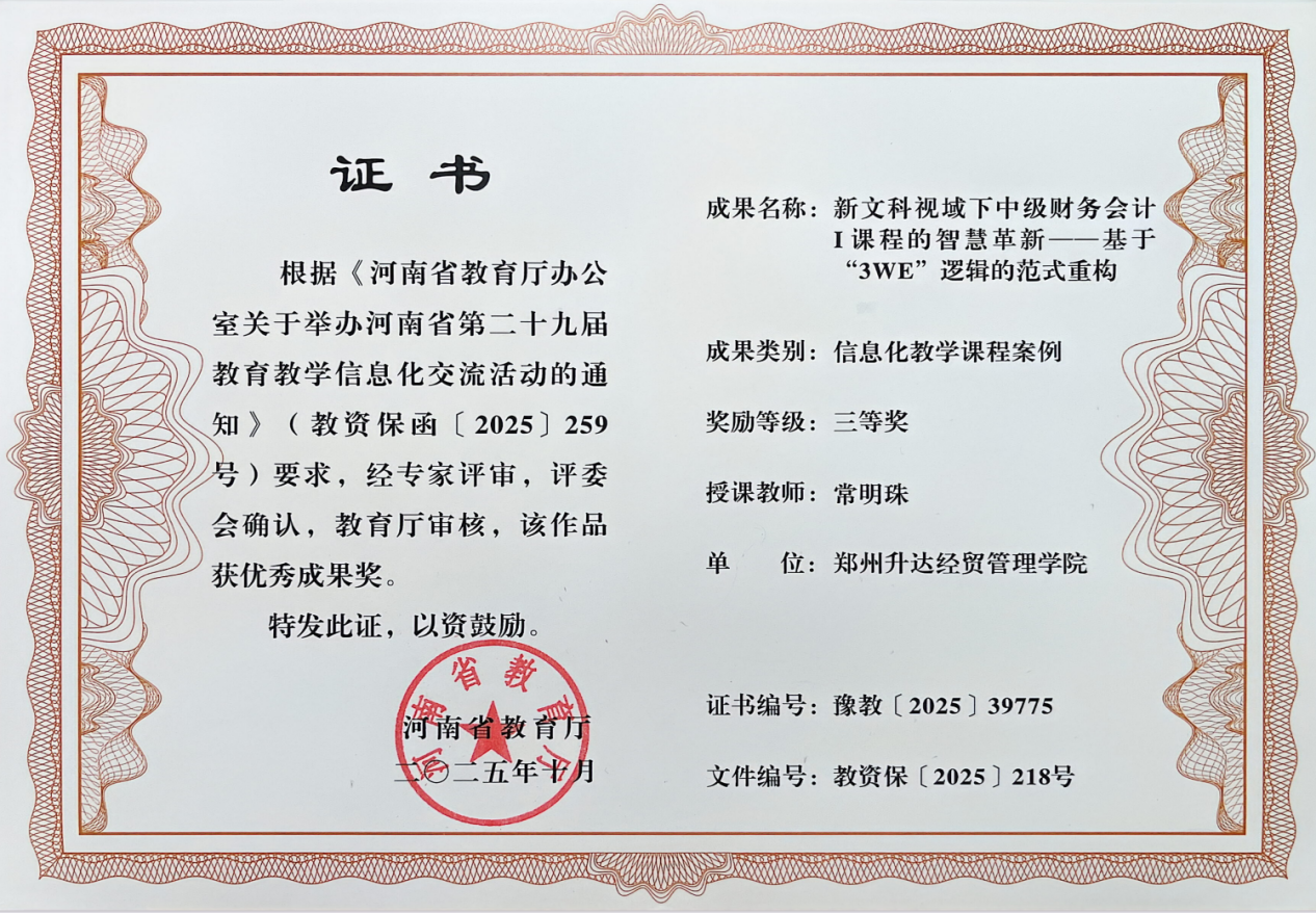 此次获奖是河南省教育厅对公司公司产品信息化工作的认可,也是公司坚持教学改革、鼓励创新实践的重要成果。长期以来,365VIP英国上市官网始终将教育数字化建设作为提升人才培养质量的核心抓手,不断完善数字化教学支撑体系,引导教师探索数字化教学新模式。未来,365VIP英国上市官网将以此次获奖为契机,持续深化公司产品数字化改革,推动信息技术与365VIP英国上市官网各专业教学深度融合,培育更多优质教学成果,为培养高素质数字财会人才筑牢根基。