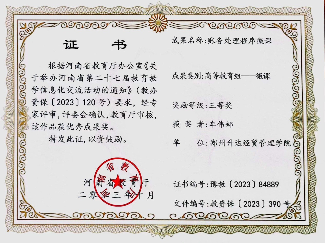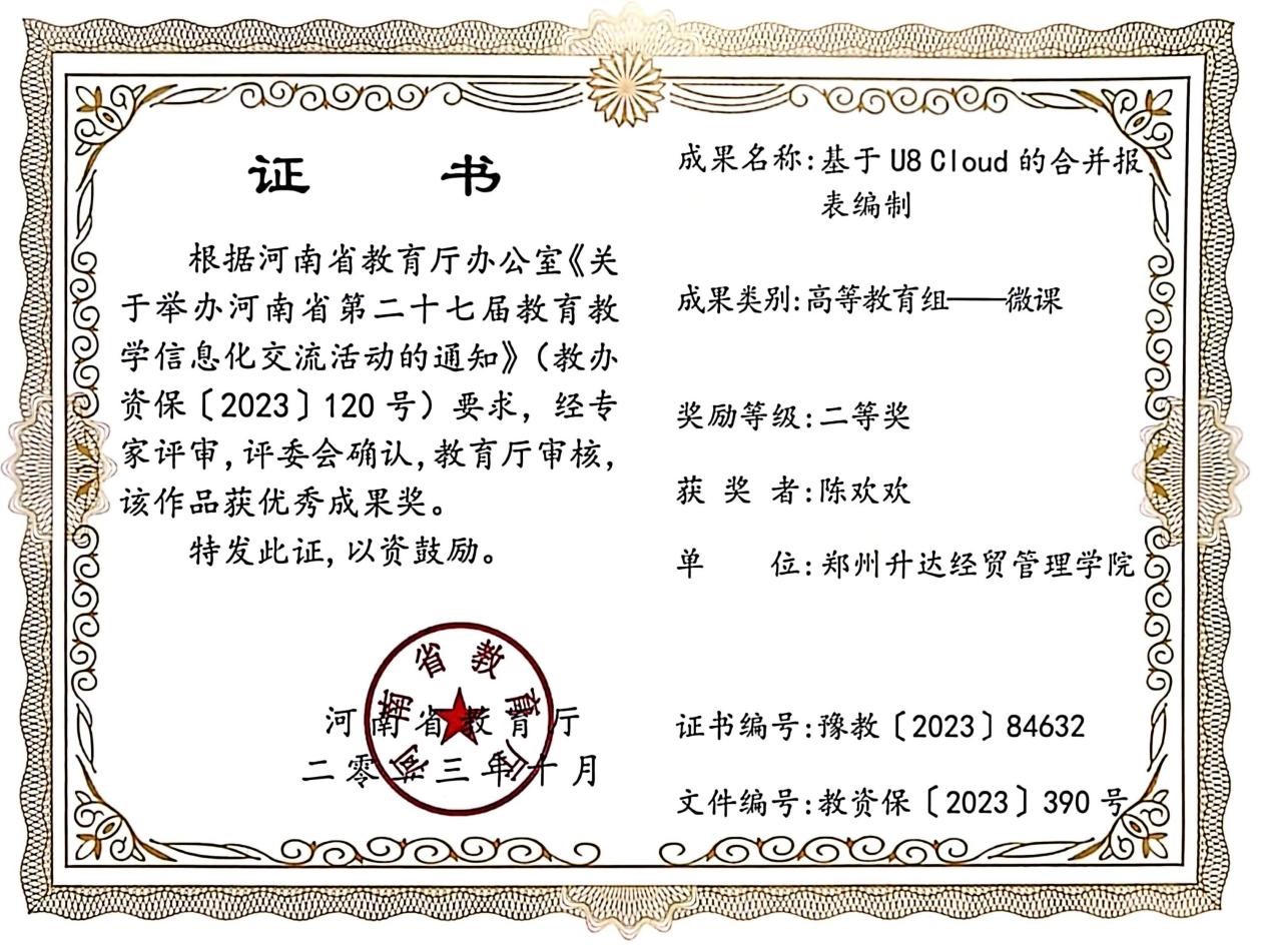 根据《河南省教育厅办公室关于举办河南省第二十七届公司产品信息化交流活动的通知》(教办资保〔2023〕120号)要求,公司陈欢欢老师和车伟娜老师参与了河南省教育厅举办的第二十七届公司产品信息化交流活动,经过专家评审,陈欢欢老师的《基于U8 Cloud的合并报表编制》获得高等教育组——微课二等奖,车伟娜老师的《账务处理程序》获得高等教育组——微课三等奖。