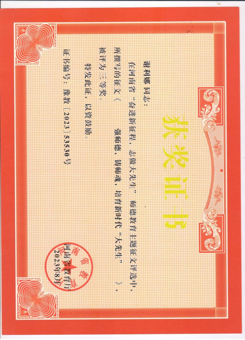 2023年8月,在河南省教育厅举办的“奋进新征程,志做大先生”师德主题教育征文和师德师风优秀案例评选活动中,365VIP英国上市官网财务管理教研室谢利娜老师参加了此次征文活动。谢老师撰写的《强师德,铸师魂,培育新时代“大先生”》一文荣获师德教育主题征文三等奖。