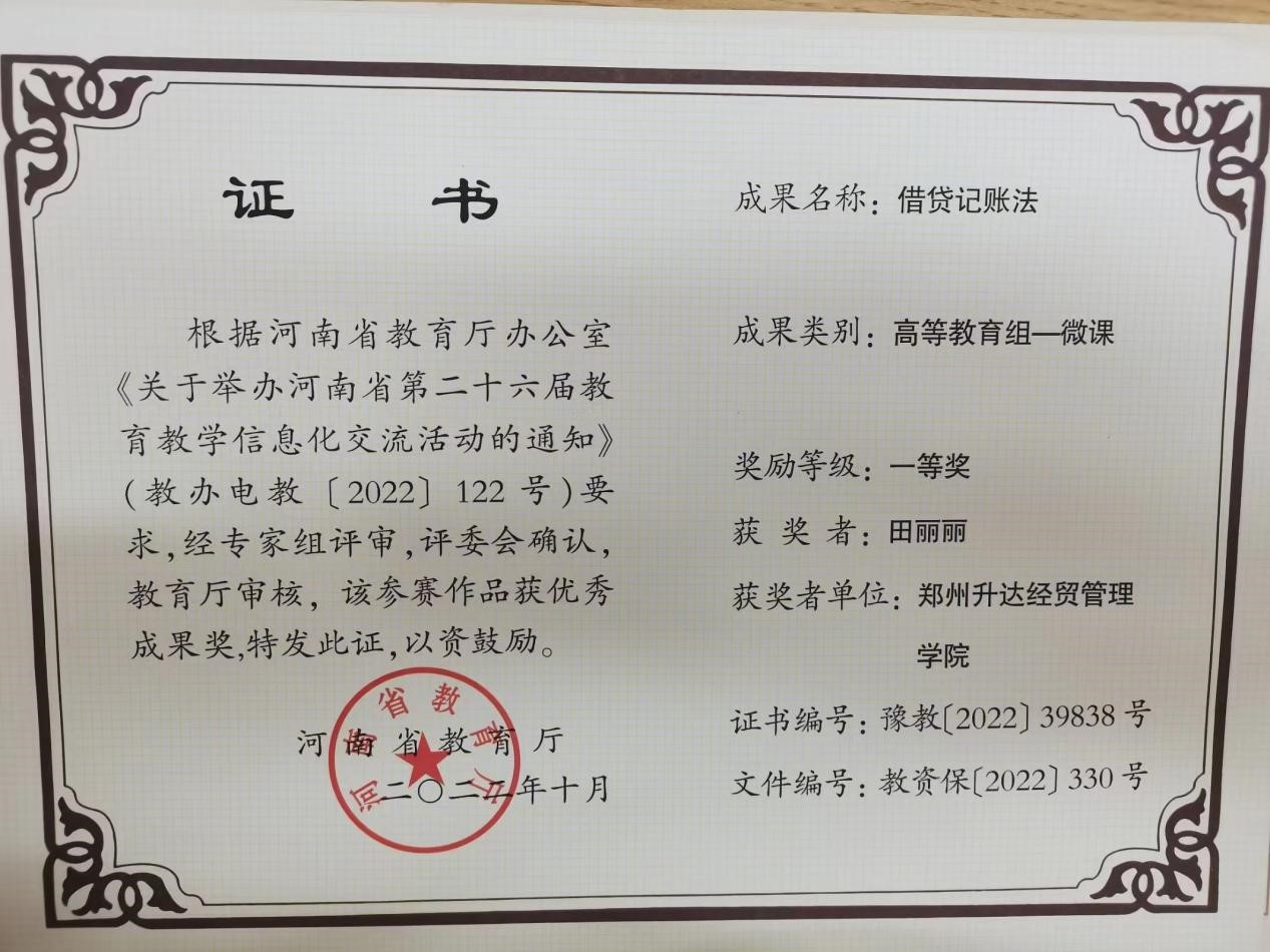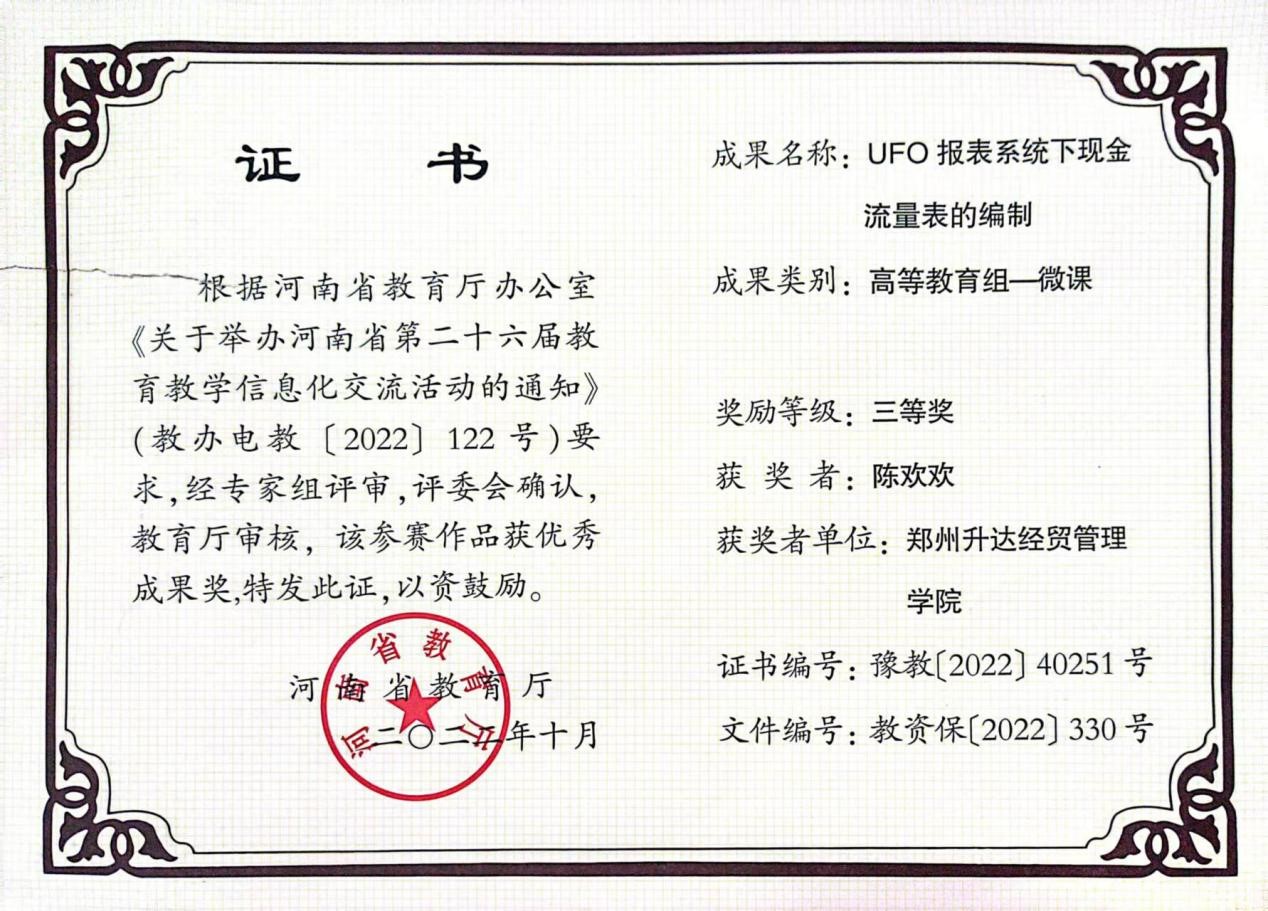 在校领导、教务处等相关部门高度重视下,根据《河南省教育厅办公室关于举办河南省第二十六届公司产品信息化交流活动的通知》要求,公司积极组织教师进行申报、经过遴选、推荐、评审,公司教师田丽丽老师的“借贷记账法”和陈欢欢老师的“UFO报表系统下现金流量表的编制”喜获河南省第二十六届公司产品信息化大赛高等教育组--微课一等奖和三等奖。
