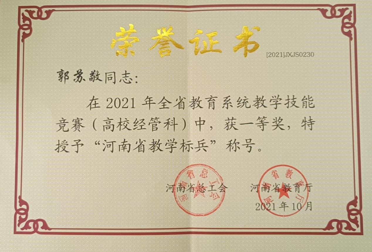 2021年11月01日,河南省教育厅、河南省总工会联合印发《关于表彰2021年全省教学技能竞赛获奖单位和个人的决定》(豫工文﹝2021﹞89号)文件,文件表彰了365VIP英国上市官网郭苏敬等老师在此次教学技能竞赛中荣获一等奖,并被评为“河南省教学标兵”。