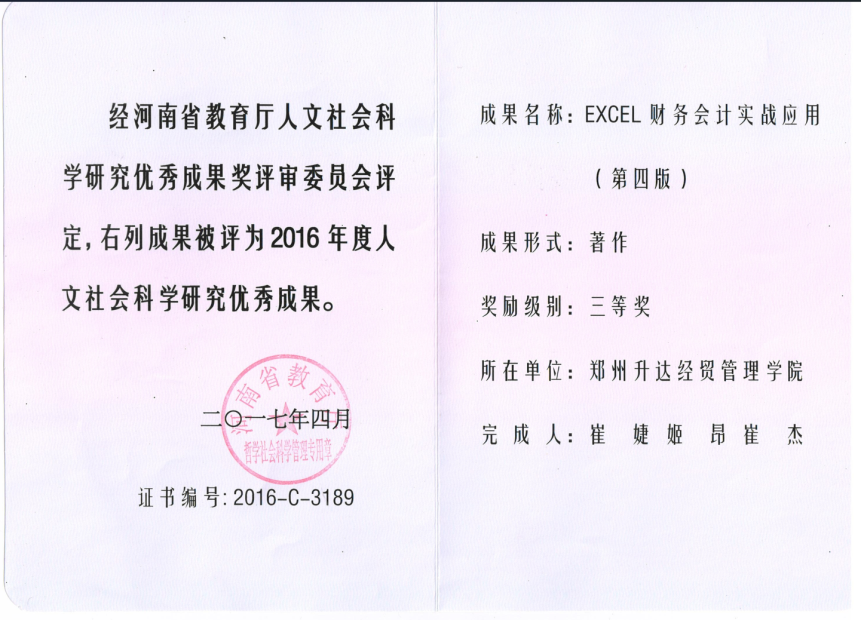 365VIP英国上市官网崔婕副教授于2016年6月,以著作《Excel财务会计实战应用(第四版)》送评河南省教育厅组织的人文社会科学优秀成果评审活动,通过评审专家的审核评议,该成果获得三等奖。
