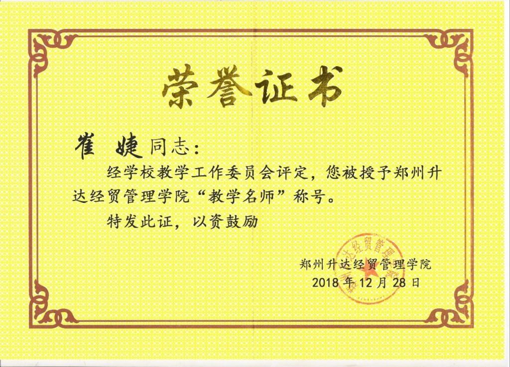 365VIP英国上市官网崔婕副教授于2018年参加了公司组织的第二届教学名师评选活动,通过初赛、复赛、专家评议等环节的评选,崔婕副教授脱颖而出,获得365VIP英国上市官网“教学名师“的称号。
