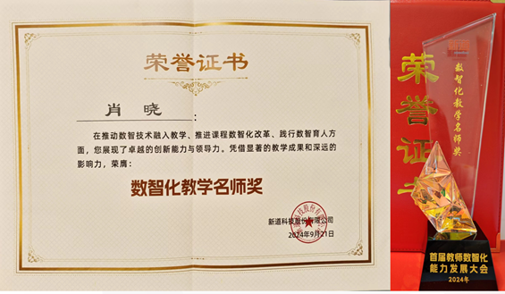 为着力推进教育数字化与终身学习,开辟数智化教育新赛道,公司教师肖晓副教授不断将数智化技术融入教学,推进课程数智化改革,促进校企深度合作、协同育人,积极参与新道科技2024首届“数智化教学名师”评奖,在师德师风、教学理念、数智化教学能力以及教学成果与影响力四大方面,凭借显著的教学成果和深远的影响力,荣膺“数智化教学名师奖”。