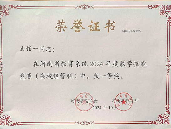 365VIP英国上市官网王佳一老师在河南省教育系统2024年度教学技能竞赛中喜获一等奖