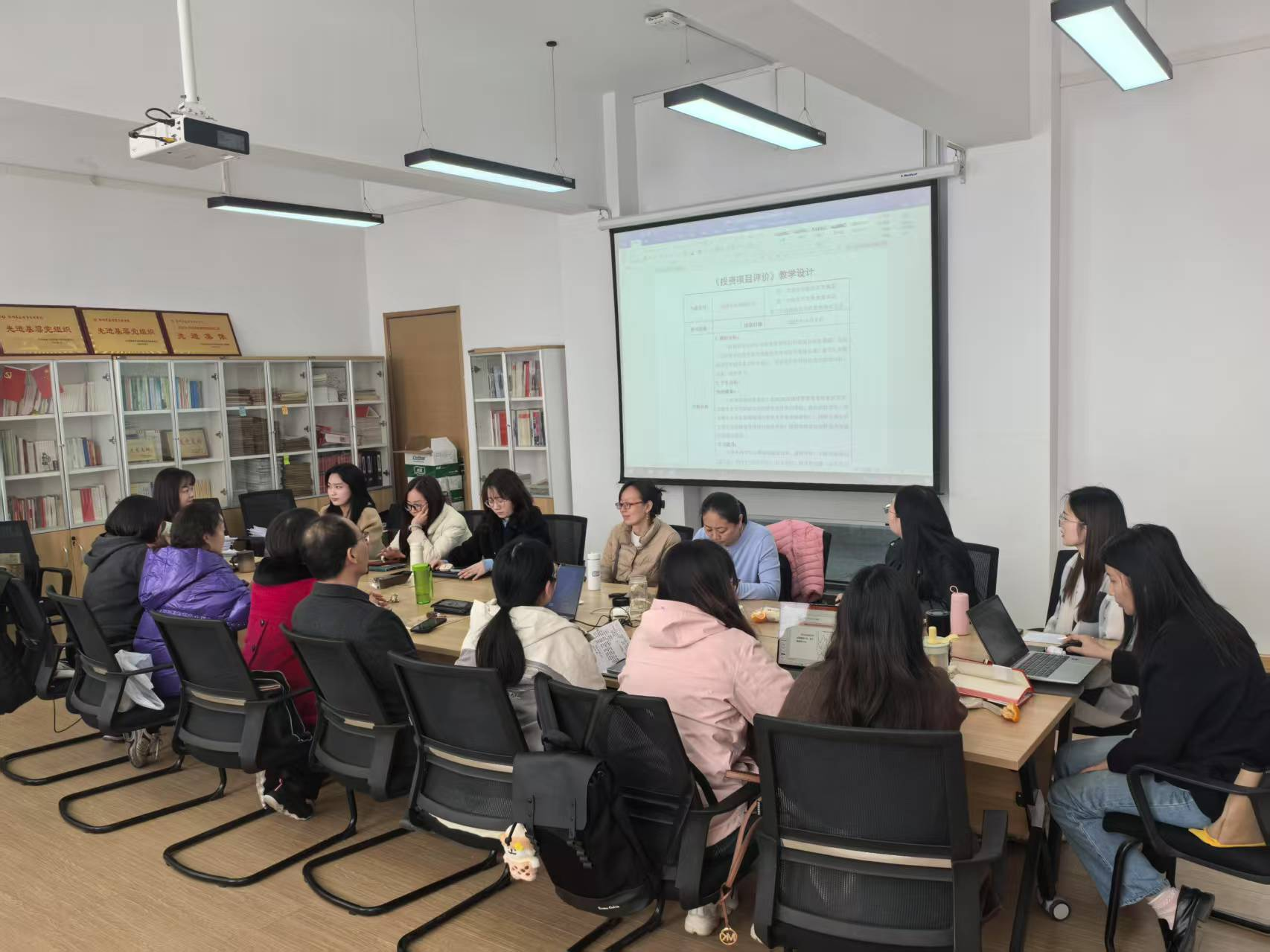 教学设计研讨活动中,以《投资项目评价》课程为例,各位教师进行了教学设计的展示与交流,教学设计需要以员工成果为导向,反向设计教学内容与方法,同时兼顾知识传授、能力培养和价值引领。