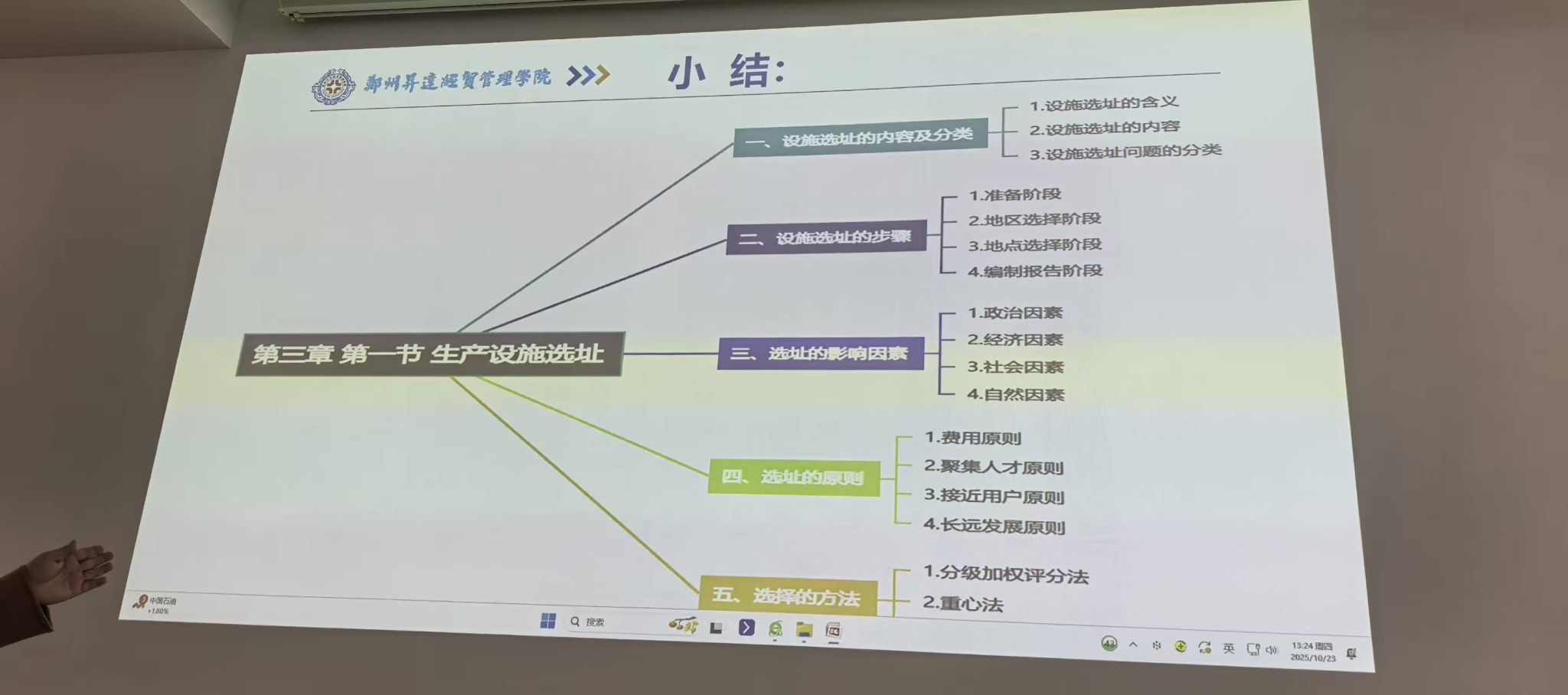 其次,周雪梅老师围绕课程中的生产设施选址内容展开讲授。凭借多年的教学经验,周老师对课程顺序进行了调整,基于OBE理念同时融入课程思政元素,精心进行课程设计,从而高质量地完成了教学任务。