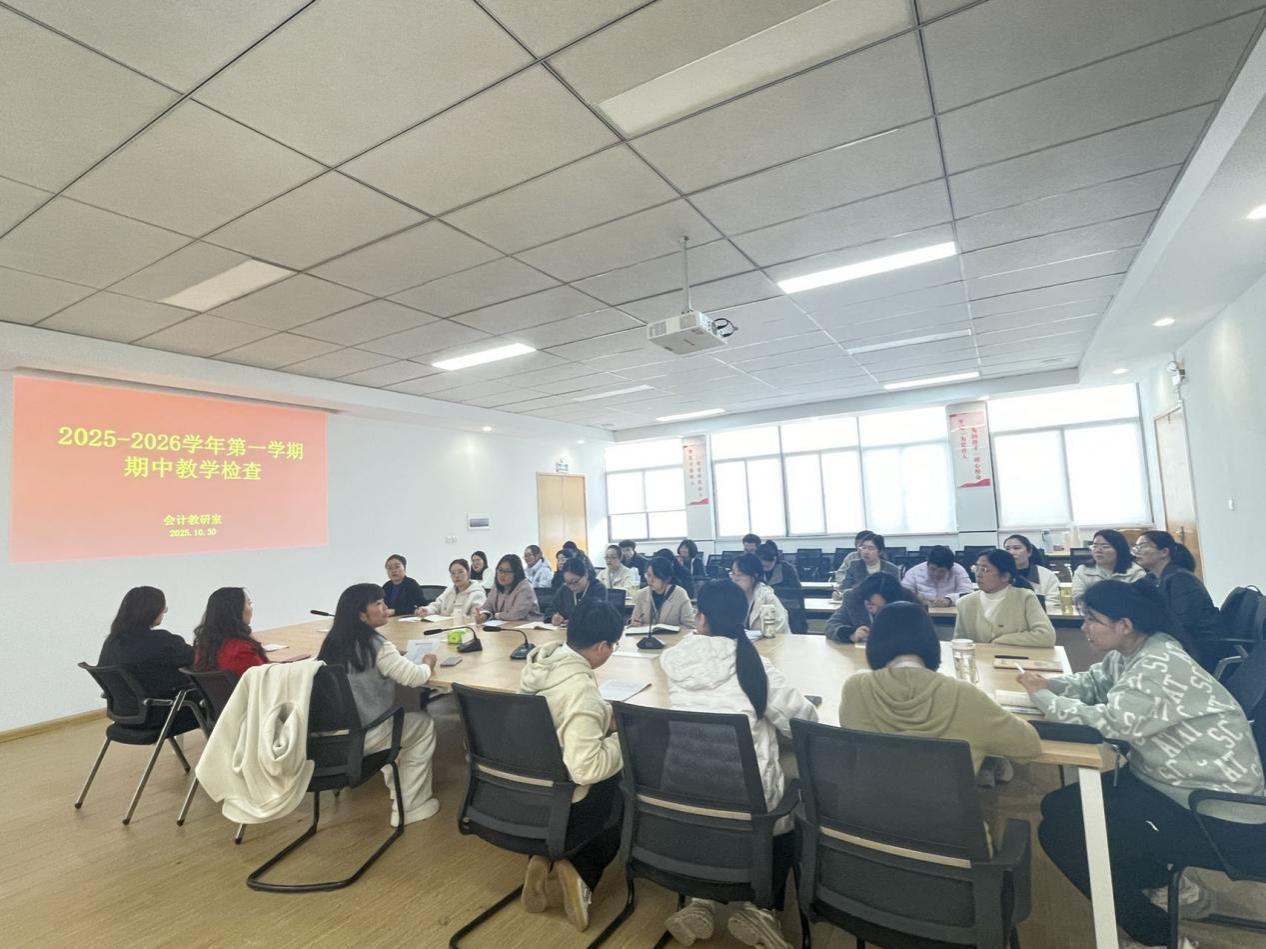 为加强教学过程管理、保障教学质量稳步提升,10月30日中午,会计教研室在四号楼209组织开展了2025-2026学年第一学期期中教学检查活动,本次活动由车伟娜主任主持召开,全体会计教研室教师参加。