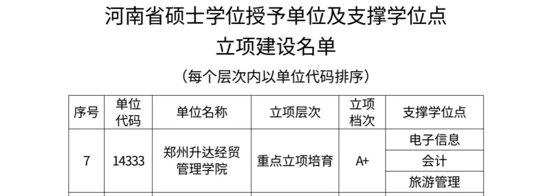 近日,河南省教育厅、河南省发展和改革委员会、河南省科学技术厅、河南省工业和信息化厅以及河南省财政厅联合发布了《关于公布河南省博士硕士学位授予单位和学位授权点立项建设名单的通知》教研〔2025〕20号,公司获批河南省硕士学位授予立项建设重点培育单位(A+),这是继2021年公司获批河南省硕士学位授予立项培育单位后,再次被确定为重点立项培育单位,等级提升为A+档。